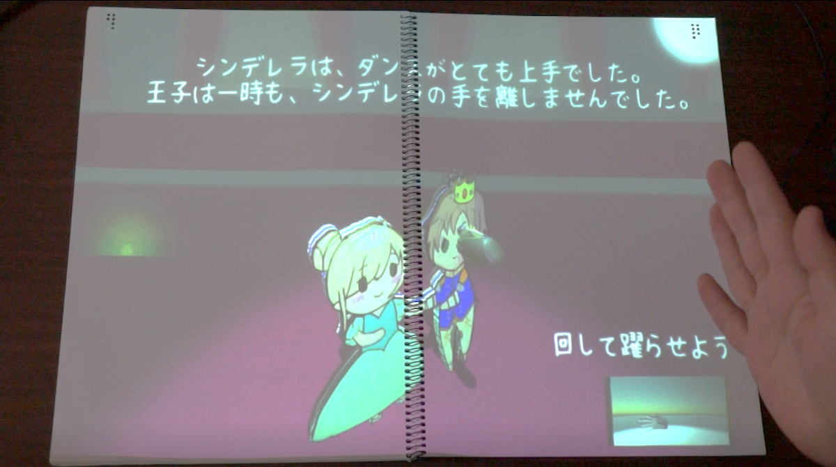 絵本をプロジェクションマッピングで表現し、その中で実際にページをめくったり、絵本の上で手を動かしたりすることでストーリーが進む仕組みです。シンデレラの童話が題材になっており、モーションセンサーや画像認識プログラムなどの技術を利用して、鑑賞者がストーリー展開に関わりながら飛び出す絵本を体験できます。