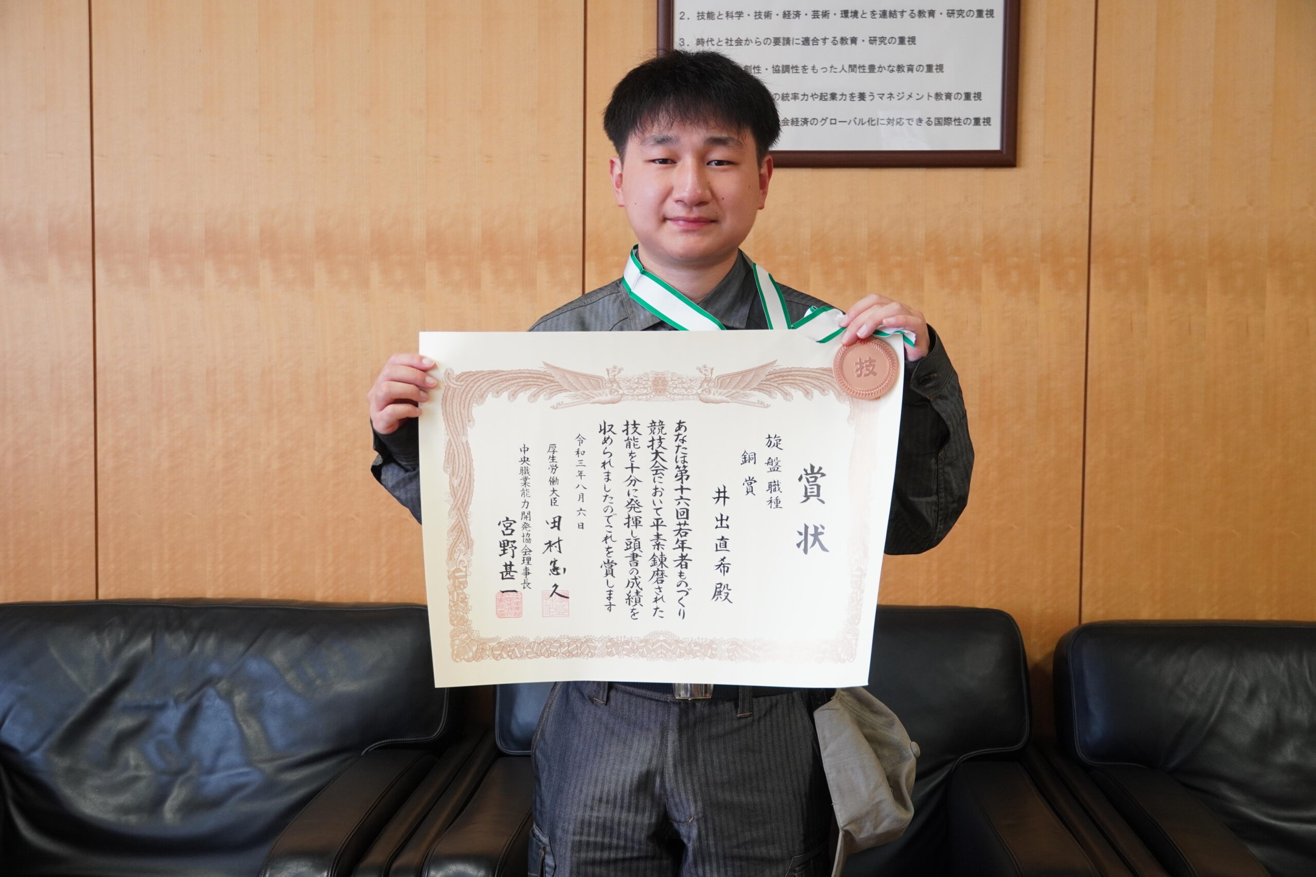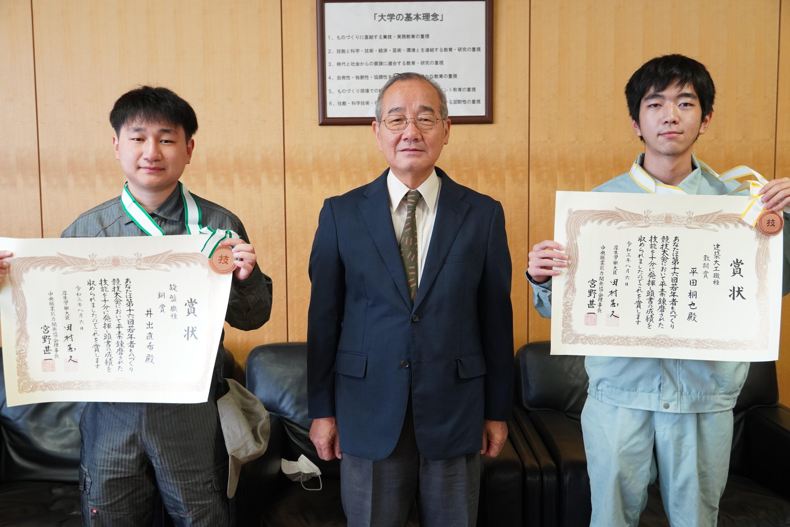 旋盤職種銅賞を受賞した総合機械学科2年の井出直希さん、建築大工職種敢闘賞を受賞した建設学科2年の平田桐也さんは、9月9日に赤松学長を表敬訪問し、学長からメダルと賞状を授与され、大会の報告を行いました。