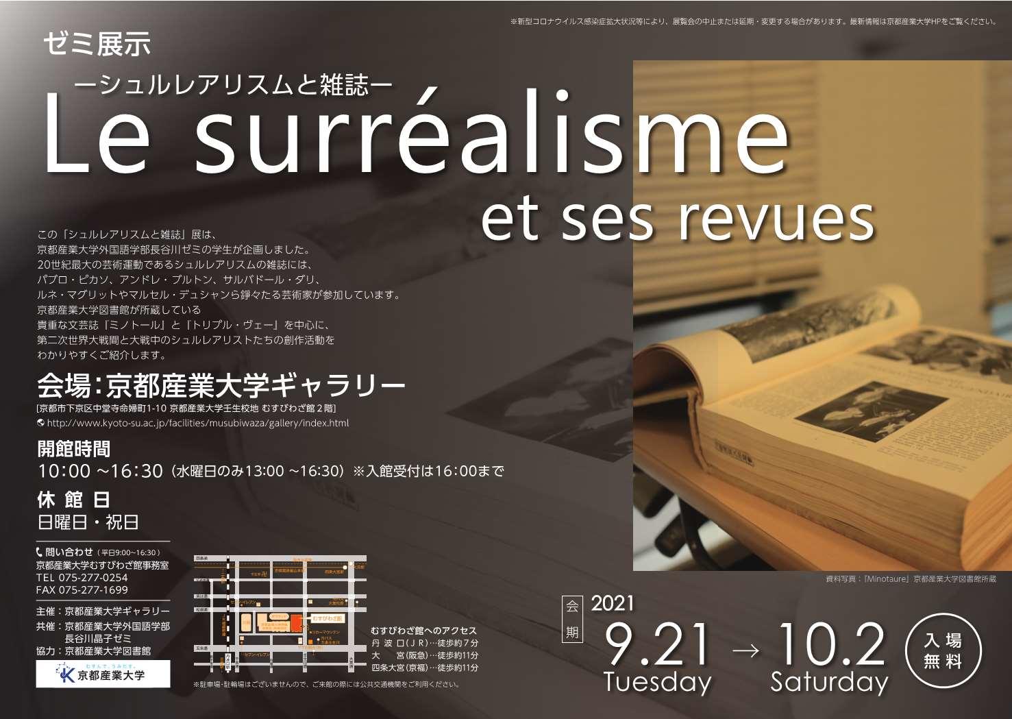 京都産業大学外国語学部長谷川ゼミ生は「コロナ禍で多くの制約がある現在と抑圧の全体主義の時代の空気に共通点があるのではないか」という発想に基づき、シュルレアリスム作品に触れることでさまざまな表現と出あい、解放感を味わってもらいたいとの考えから展示会を企画した。パリで発行された文芸誌『ミノトール』(1933-39)とニューヨークで発行された『トリプル・ヴェー』(1942-44)の一般公開は本学では初めての試みである。