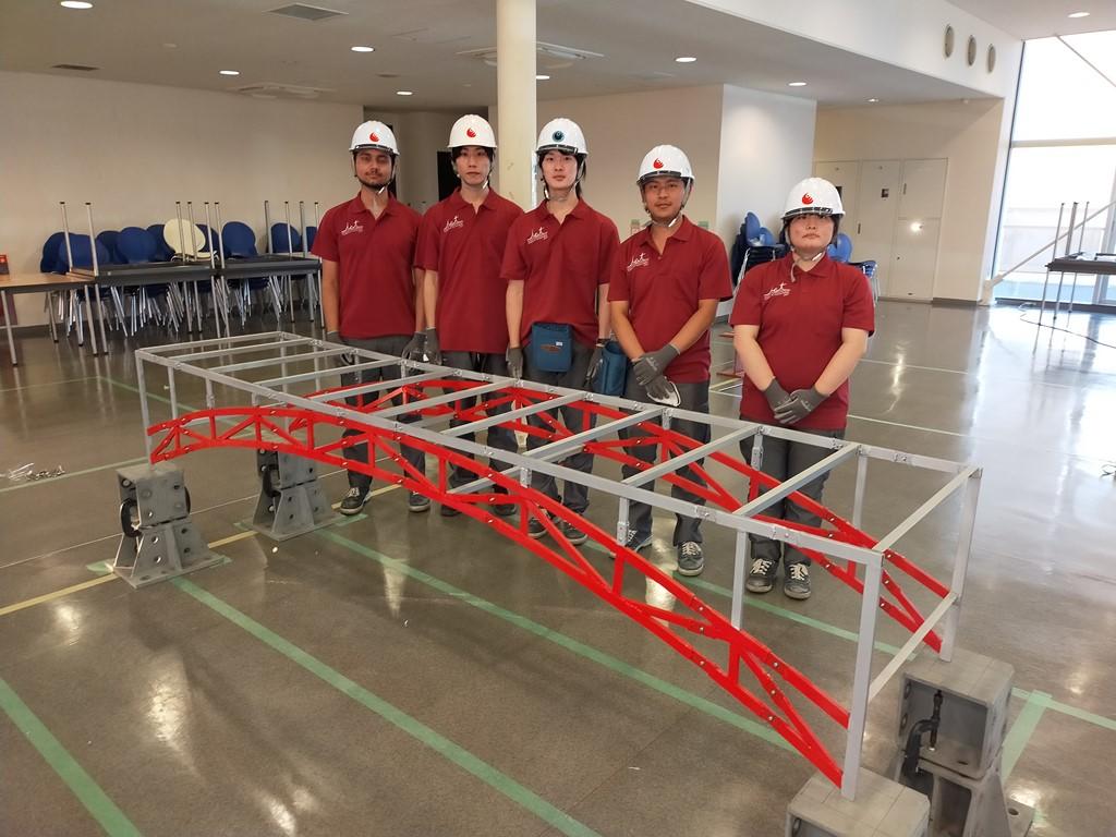 本学からは、技能工芸学部建設学科 大垣研究室所属の3年生の2チームが出場し、長期インターンシップ前後にも関わらず、好成績を収めることができました。また、継手(接合部)は、総合機械学科の武雄研究室の学生がレーザー切断機で特殊な加工を行いました。橋の塗装については、建設学科の大竹講師が指導を行いました。