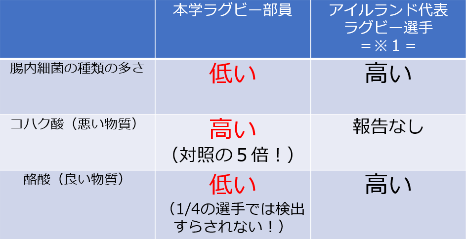 ※1:2014年ラグビーのアイルランド代表チームの腸内環境が調べられ、一般健常人よりも腸内環境が良いことが報告された(Clark et al. 2014 Gut)