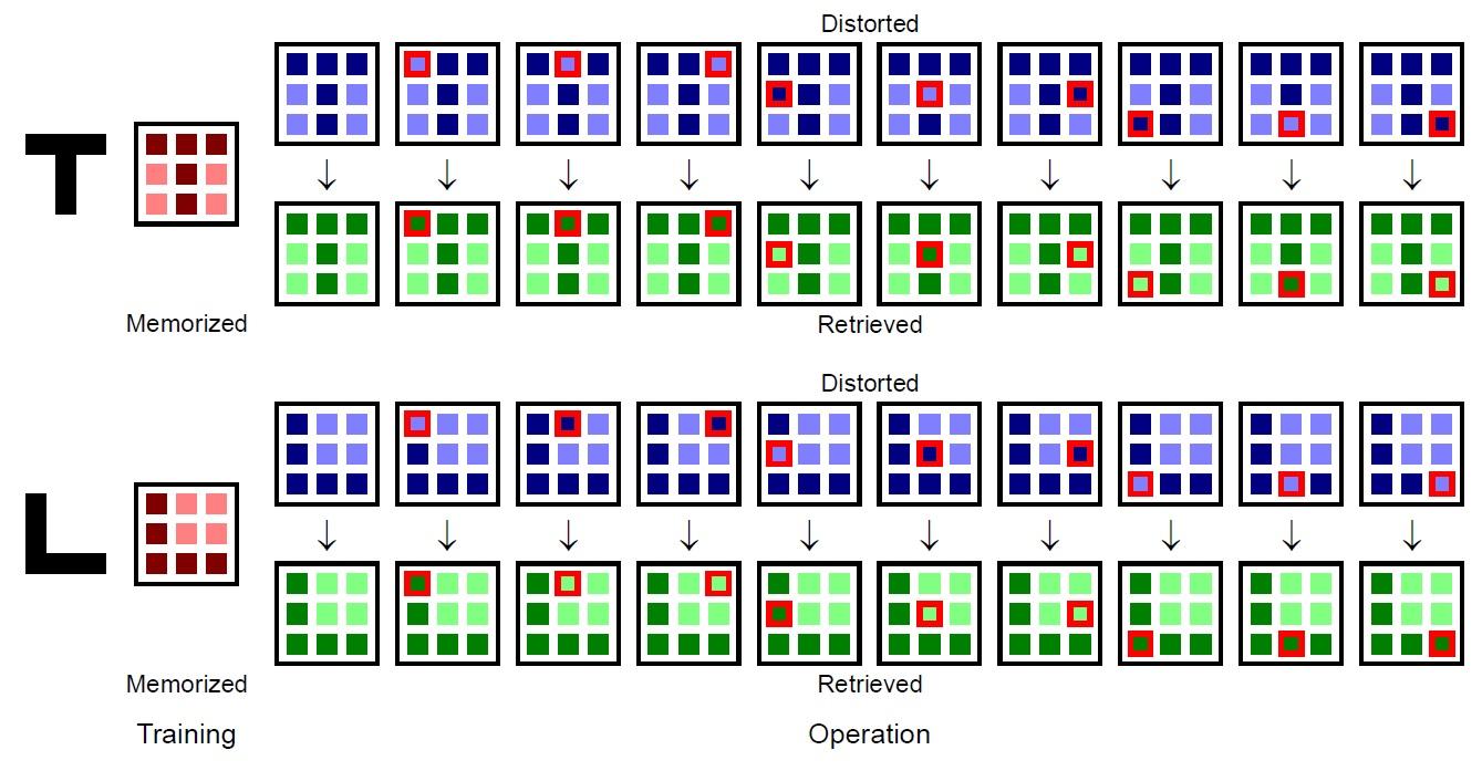 メムキャパシタと自律局所学習を用いるニューロモーフィックシステムを、実際に組み立てました。アルファベットの「T」と「L」を記憶させ、わずかに異なるパターンを入力するとき、記憶した「T」または「L」のより近いほうが出力されることを確認しました。この動作は「連想記憶」というもので、文字認識や画像認識に直接に応用できるものであると同時に、問題設定により、さまざまな人工知能の取り扱う課題に応用できるものです。