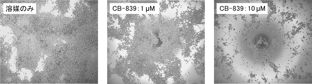 同細胞にグルタミナーゼ阻害剤を処置したところ、クエン酸回路【注2】の抑制、細胞周期の停止、細胞死の誘導が起こり、生存率が低下しました。