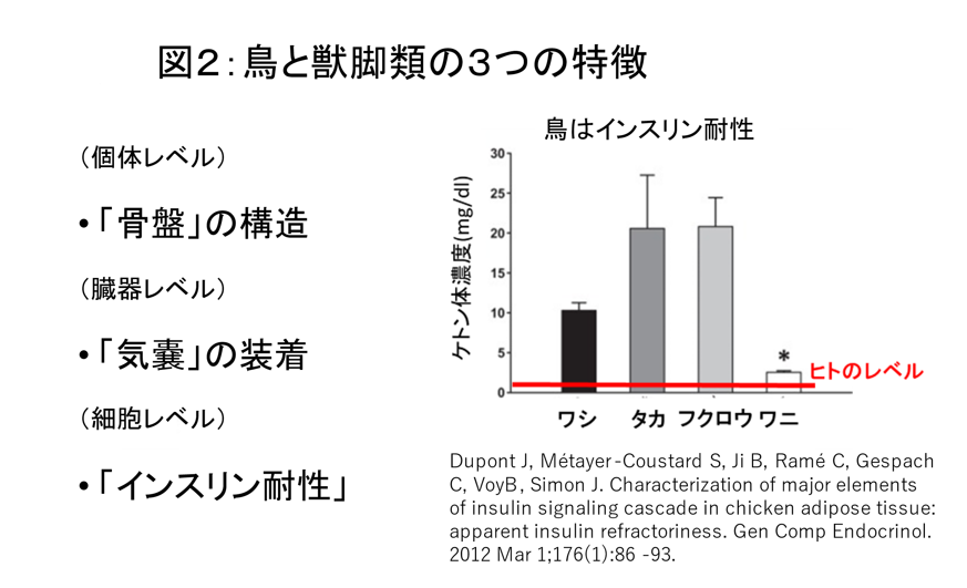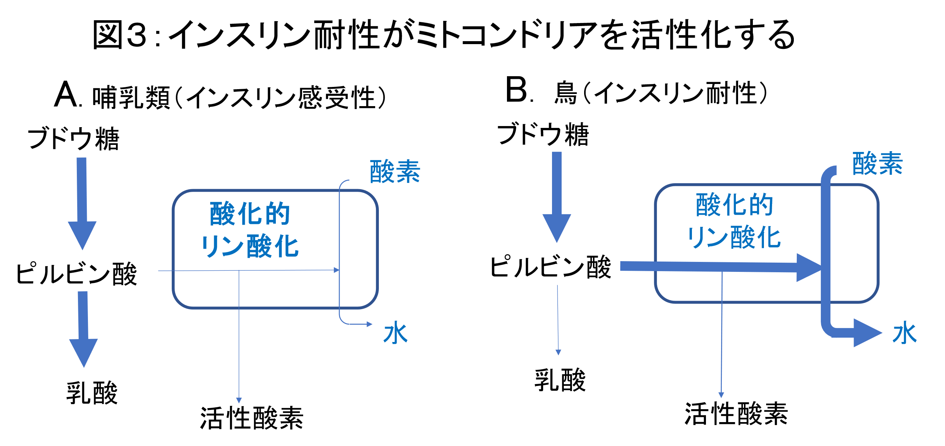 鳥は、哺乳類と比較して3つの生理学的な特徴を有します。1)骨盤を高く持ち上げることにより、二足歩行が可能 2)気嚢を装着することにより、哺乳類の数倍のガス交換能力を獲得 3)インスリン耐性により、ミトコンドリアの活性を持続的に高く保つことが可能であることです(図2)。例えば鳥ではインスリン受容体のリン酸化が起こらず、血糖値やケトン体濃度がヒトより数倍以上高いことが知られています。