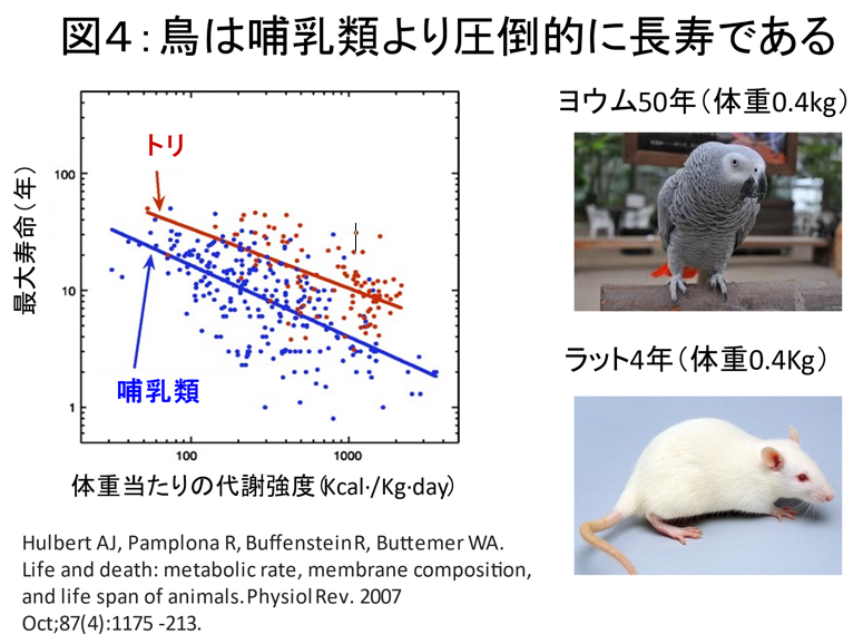 鳥は哺乳類に比べ高い運動性能を有し酸素消費も高い一方、活性酸素の放出が少なく、がんや肥満などの生活習慣病になることも非常に稀であり、最大寿命も哺乳類の倍以上とされています(図4)。この現象は鳥の生理学では最大の謎のひとつでした。本論文から、鳥は老化ホルモンであるインスリンの作用が最小限に抑えられるので長寿である可能性が示唆されます。