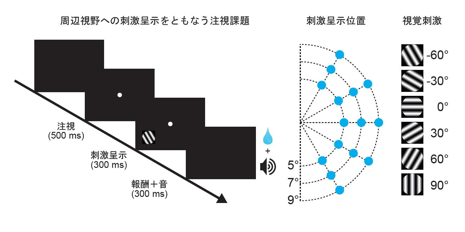 記録実験の行動課題としては、簡単な注視課題を用いました。サルがモニター中央に呈示される注視点を見つめていると、一瞬、視野周辺に特定の傾きをもった視覚刺激(ガボールパッチ)が呈示されます(図2)。サルは刺激呈示中も注視点を見続ける必要があり、一定時間注視を続けると報酬が得られます。微小内視鏡法では、ベースプレートにミニチュア顕微鏡を取り付けるだけでイメージングを行うことができます。視野内のさまざまな位置にさまざまな傾きをもった刺激を繰り返し呈示し、留置したGRINレンズからの蛍光信号を記録しました。