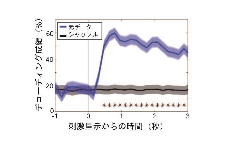 また、得られた多数の細胞からの蛍光信号のデータを用いて、サルが見ている視覚刺激の傾きを機械学習の方法を使って解読する(デコーディングする)ことにも成功しました(図4)。