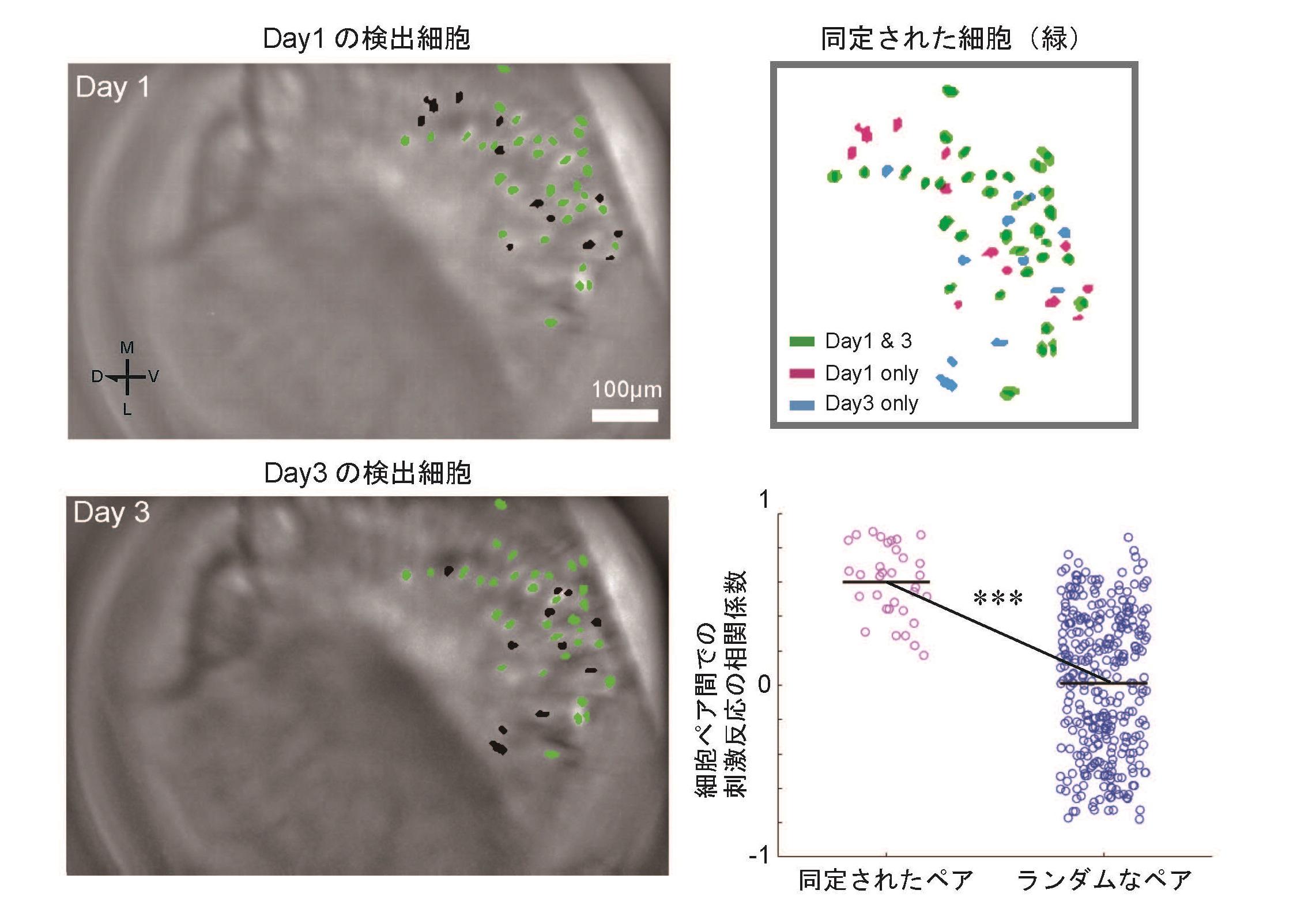 微小内視鏡法では、カルシウムインジケーターを発現した神経細胞群とGRINレンズの観察面との位置関係が安定している場合、日を跨いで同じ細胞を観察し続けることができます。我々は異なる日に得られたデータを使って細胞追跡を行い、多数の細胞を同定することにも成功しました(図5)。