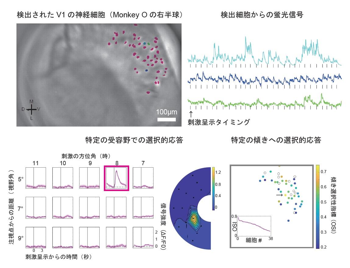 そこで我々は、マカクザルの第1次視覚野(V1)をターゲットとして、微小内視鏡法を適用するためのメソッドを開発しました。V1の神経細胞は視覚刺激によって容易に活動を誘発することができ、また、視野内の特定の場所に反応したり(受容野特性)、特定の傾きの刺激に反応したり(傾き選択性)といった特徴を持つことが知られています。