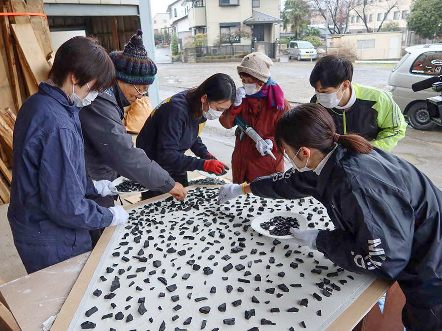 新国立競技場前にたたずむ「五庵」は、都会で異色を放ち、型にはまらない新しい日本文化を発信している。学生たちは昨年から茶室の制作プロジェクトに参画し、2020年3月には埼玉県にある工房で内部の天井材の漆喰塗りや、天井に無数に張り付けられた炭の加工・張り付け作業を行った。