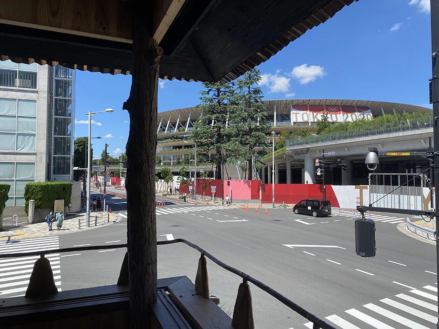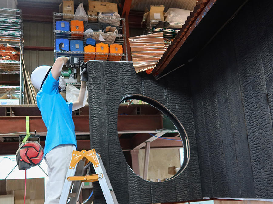 その後、東京2020大会の延期が発表されたことを受けて開催時期が変更となり、制作を一時中断したが、2021年5月に同じ工房で2階部分の外壁に使用された焼杉の加工・取り付けを行った。