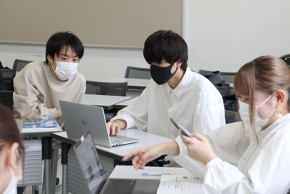 学生らは、企画を考えるために自身のパソコンやスマートフォンを活用して調べものをしたり、自分たちの意見をまとめて読みやすいスライドを作成するなど、積極的にワークに参加しています。