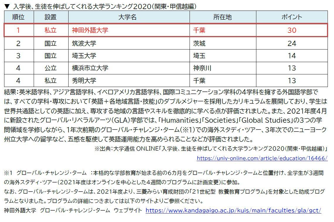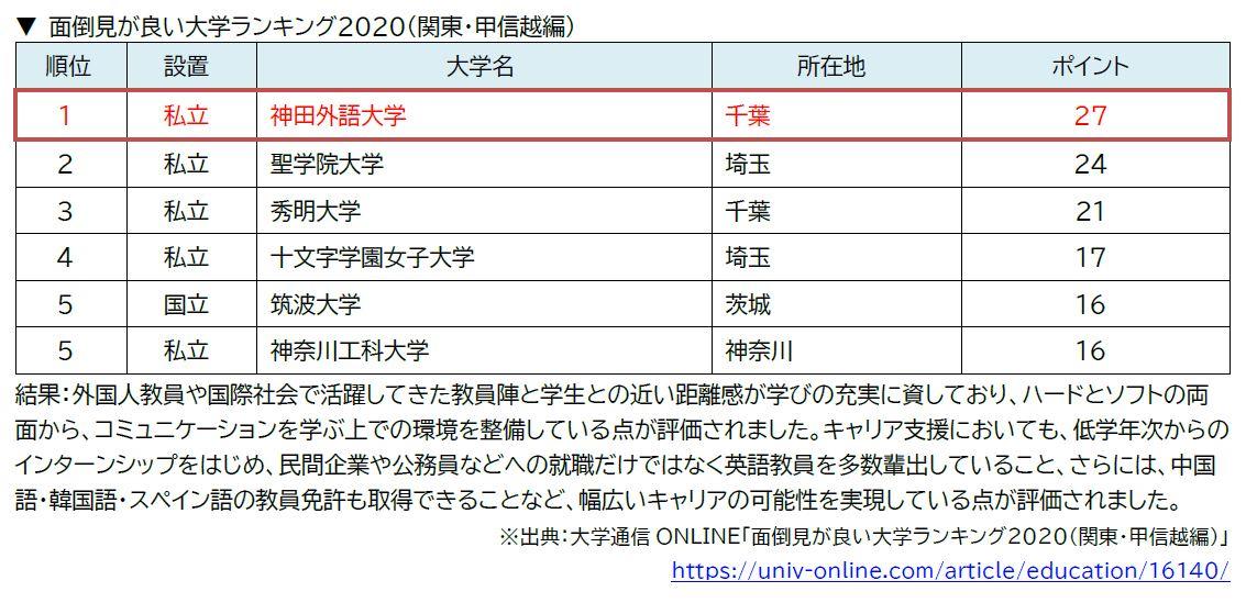 神田外語大学が大学通信ONLINE「グローバル教育に力を入れている大学ランキング2020」「入学後、生徒を伸ばしてくれる大学ランキング2020」「面倒見が良い大学ランキング2020」(関東・甲信越編)で第1位にランクイン