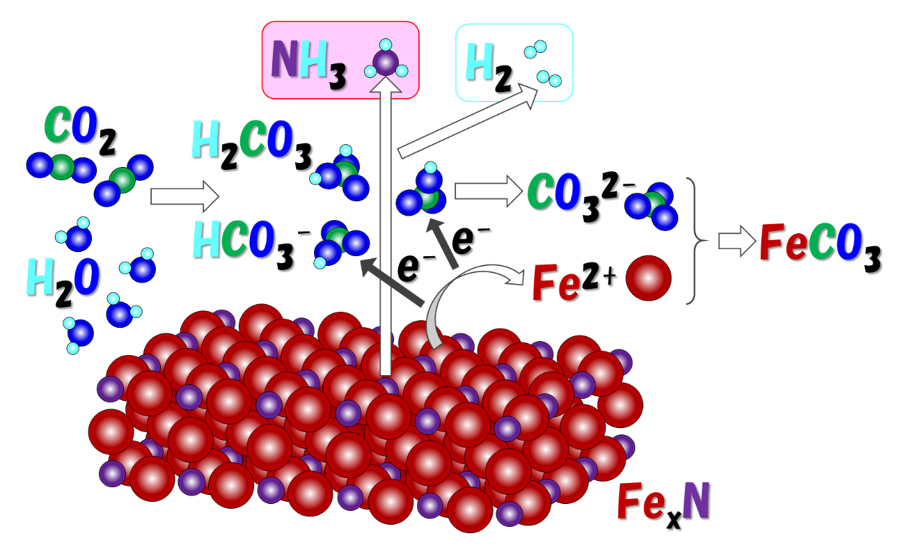 反応のメカニズムは次のように予想しています。侵入型化合物であるFexNのFeが電子を放出してFe2+へと酸化し、この電子が、水に由来する炭酸H2CO3や炭酸水素イオンHCO3-に与えられてH+を還元し原子状のHが生成します。このHがFexNのNと結合して、アンモニアNH3を生成します。Fe2+は、炭酸イオンCO32-と結合してFeCO3の固体として析出します。