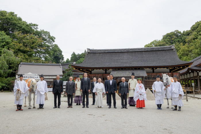 上賀茂神社(正式名:賀茂別雷神社)で10年ぶりに執り行われた神馬「神山号」の交代式「神馬奉献退任奉告祭」において、京都産業大学馬術部部員4人が神馬の馬引きの役割を担った。