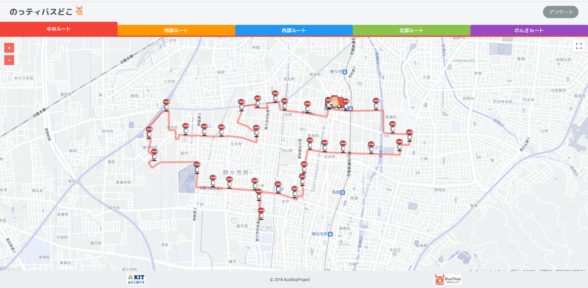 そこで、金沢工業大学と国際高等専門学校の学生による「BusStop プロジェクト」(金沢工業大学学生19名、国際高等専門学校学生5名。指導教員:伊藤隆夫 金沢工業大学教授、袖美樹子 国際高等専門学校 准教授)では、バスの現在位置がスマートフォンでわかるアンドロイド版アプリの開発に取り組むとともに、リアルタイムでバス内の混雑具合もスマートフォン等でわかるようにして、利用者の利便性向上を目指します。