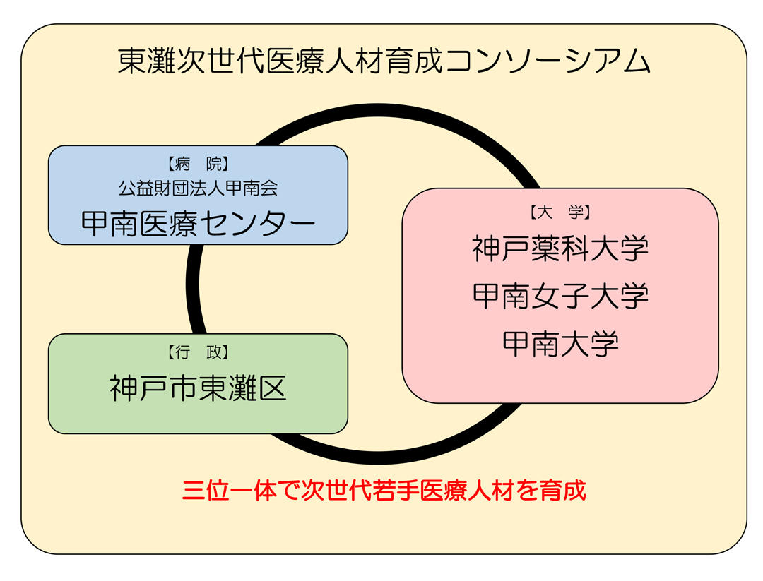 地域の三大学と甲南会が連携してコンソーシアムを形成するとともに、東灘区の行政の協力も得て、病院、大学、行政が三位一体となった次世代若手医療人材の育成を目指す活動を行っています。