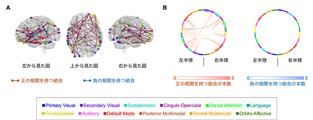 次に、児童期の運動経験を有している人のGo/No-Go課題の誤答率と関わる脳の構造的・機能的領域間結合を調べました。その結果、脳の構造的領域間結合に関しては、児童期の運動経験を有している人は、Go/No-Go課題の誤答率と正の相関関係を示す結合(図2A赤色の結合)と負の相関関係を示す結合(図2A青色の結合)が認められました。Go/No-Go課題の誤答率と正の相関関係を持つ構造的領域間結合の大半(73%)は大規模ネットワーク間の結合でした(図2B左)。一方、Go/No-Go課題の誤答率と負の相関関係を持つ構造的領域間結合の大部分(88%)が左右の半球間の結合でした(図2B右)。機能的領域間結合に関しては、児童期の運動経験を有している人では、Go/No-Go課題の誤答率と正の相関関係を示す結合(図3A赤色の結合)が認められましたが、負の相関関係を持つ結合は認められませんでした。Go/No-Go課題の誤答率と正の相関関係を持つ領域間結合の大部分(91%)は、大規模ネットワーク間の結合でした(図3B左)。児童期に運動経験を有していなかった人ではGo/No-Go課題の誤答率と関わる脳の構造的・機能的領域間結合は認められませんでした。最後に、児童期の運動経験を有している人のGo/No-Go課題の誤答率と関わる脳の皮質構造指標を調べました。その結果、児童期の運動経験を有している人では、脳の皮質厚とGo/No-Go課題の誤答率の間に負の相関関係が認められ、神経突起の方向散乱の程度ならびに密度とGo/No-Go課題の誤答率の間に正の相関関係が認められました。以上の結果から、児童期に運動経験を有している人は、ネットワークのモジュール分離と左右半球間の構造的結合の強化によってGo/No-Go課題の誤答率を減らしていることを示唆しました。