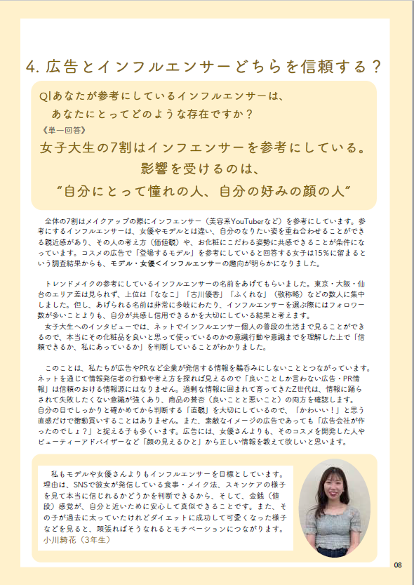 Z世代は、情報を信頼して良いかを判断するために、発信者の普段の行動や発言をインターネットで調べ、誠実な人なのか、自分と同じような生活レベルの人なのか、同じ肌質の人なのかなどを確認します。広告に起用される女優・モデルさんは、自分と生活感覚が違う、元の素材から違うなど遠い存在と感じています。