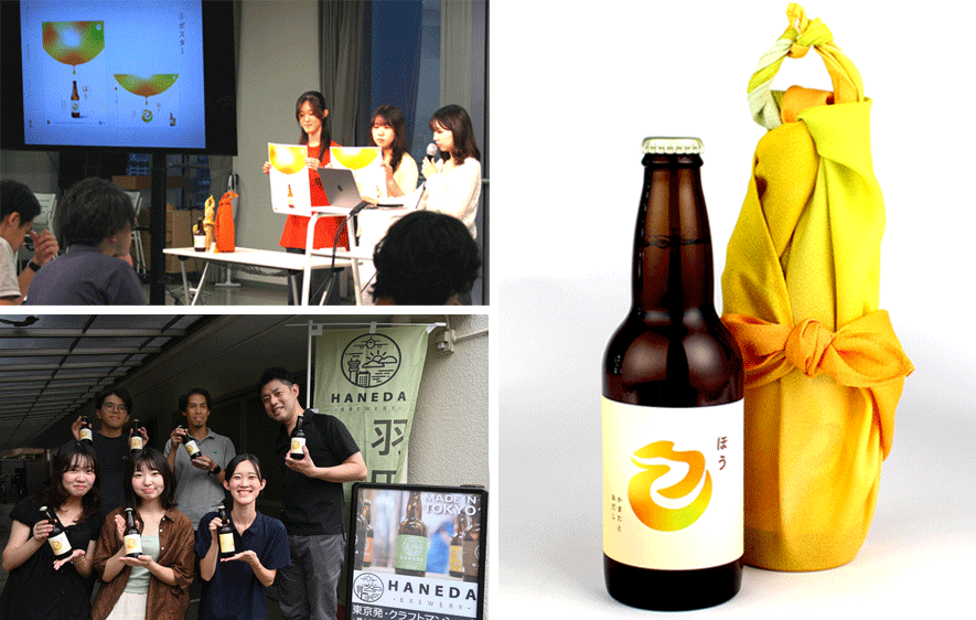 この取り組みは、地域の魅力の抽出からコンセプト立案、製造、商品化、宣伝、販売までのプロセスを体験的かつ実践的に学ぶデザイン教育プログラム(注1)であり、4月~6月にかけて同学部3年生の有志45名が参加。大田区内のクラフトブルワリー3社との連携のもと、12チームによる「新商品開発コンペ」を開催し各社へのプレゼンテーションを行いました。この第1弾(注2)として、(株)羽田麦酒と3名の学生チームの協働による商品化が実現しました。