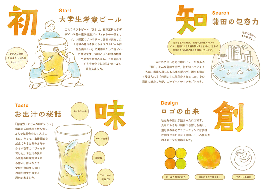 同学生チームは、蒲田の街中をリサーチする中で、多国籍料理店などが並ぶ繁華街から昔ながらの銭湯まで一見混沌としたイメージの中にも、国籍や世代、暮らしを問わず多様な人々や文化を温かく受け入れる土地柄の「包容力」というテーマに着目。商品コンセプト、副原料案、味覚構成、ネーミング、ラベル、販促品などの提案をはじめ、メーカーと製品化に向けた協議や試作を重ねてきました。同商品は、上面発酵製法を用いた琥珀色のアンバーエールで、麦芽の甘みと鰹節・昆布・椎茸で取った出汁の風味がじんわりと広がる、苦みを包み込むようなまろやかな仕上がりとなっています。また飲む温度によっても香りの変化を感じることができるほか、炭酸は中程度の細かな泡に調整することで優しい飲み心地も追求しました。パッケージなどのデザインは、丸みを帯びた「包」のロゴと、出汁の効いた豊かな味と多様な個性が混じる街のイメージをグラデーションで表現しています。