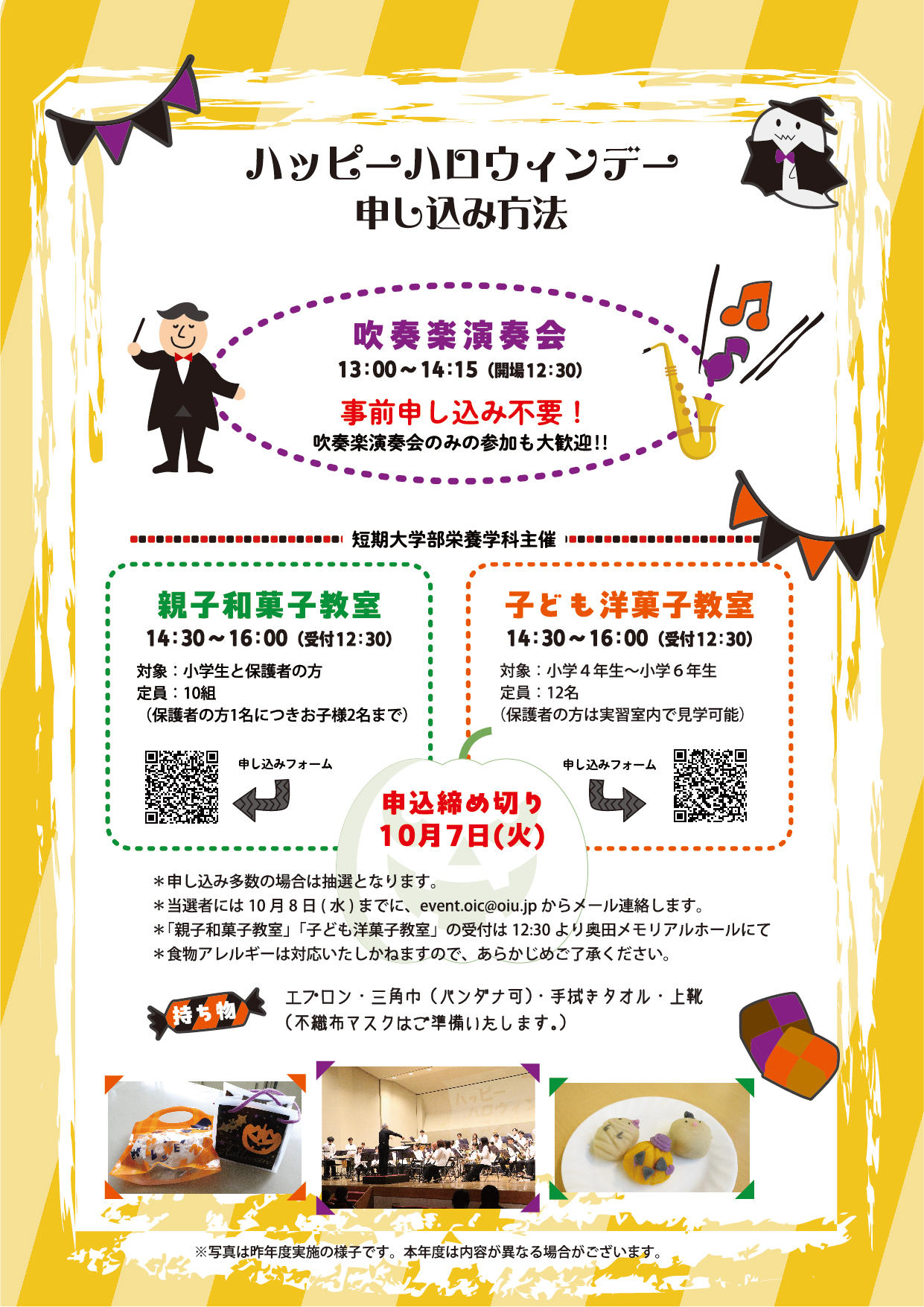 入場無料(吹奏楽演奏会:事前申込不要・お菓子教室:事前申込必要)