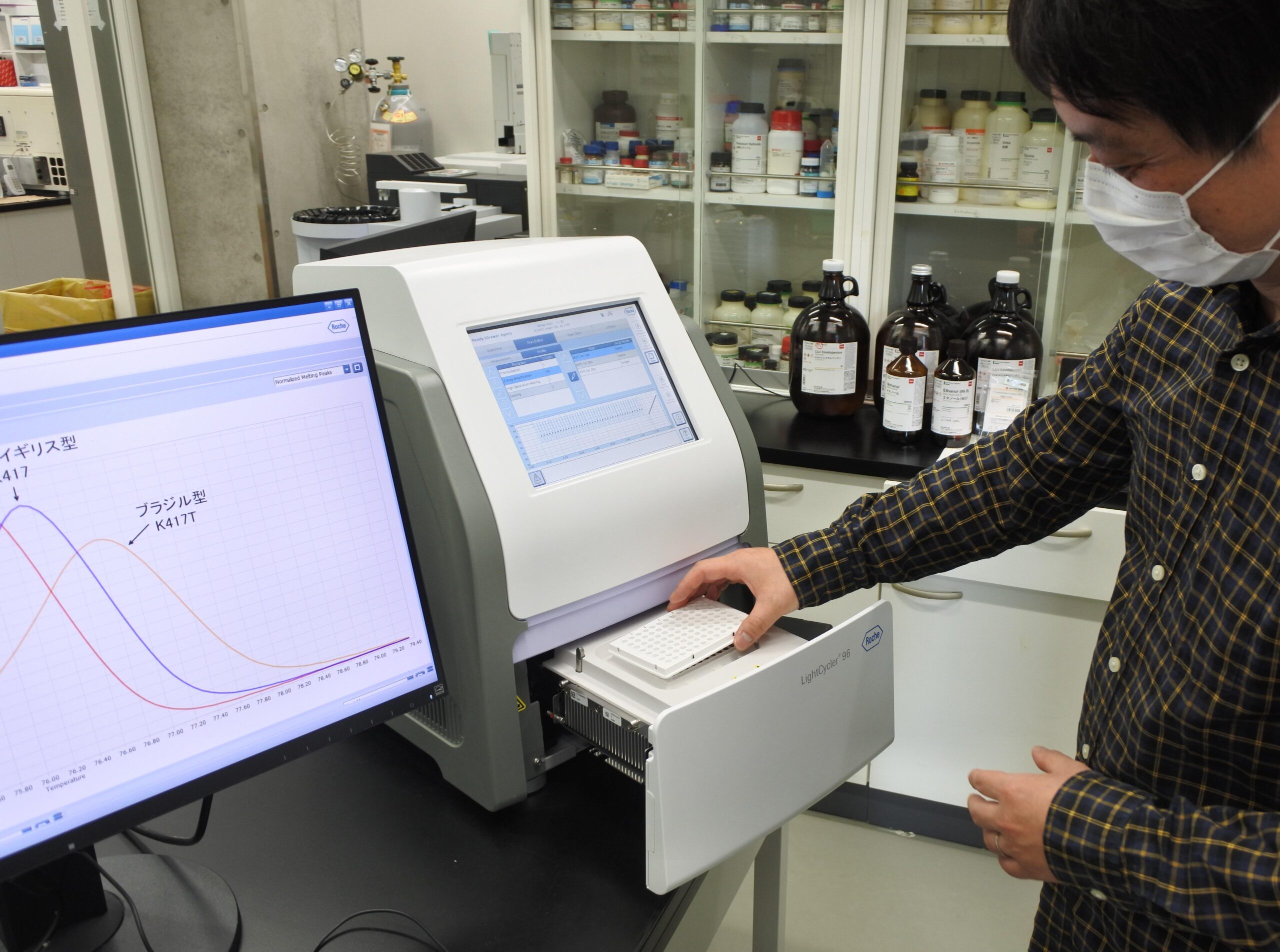 一般的なPCR検査の装置(添付写真参照)をそのまま使用して、いずれの変異株も90分程度で識別することが可能です。全ゲノム解析に要する期間(1週間程度)を大幅に短縮でき、変異株の脅威にさらされる昨今、社会実装が期待されます。