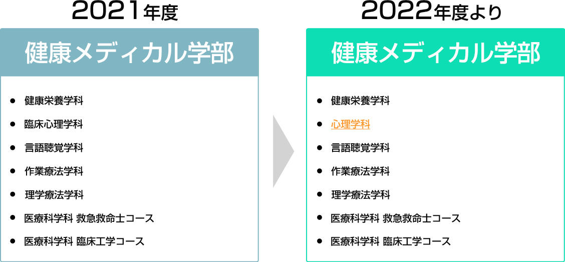 また、社会に役立つ「心のスペシャリスト」を養成する健康メディカル学部臨床心理学科は「健康メディカル学部 心理学科」に変更する。