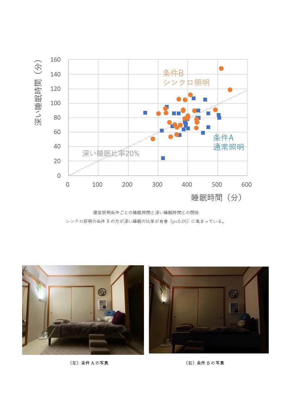 検証では、現在地の自然光に合わせて調光(明るさを調節)・調色(色温度を調節)するとともに、ヘッド(照明の光源部分)を回転させることのできる照明器具を用いました。被験者4名が、条件A(通常照明)と条件B(シンクロ照明※3)の環境で、それぞれ5日間、睡眠時のデータを、睡眠時間・睡眠の質を計測できるスマートウオッチで取得しました。その結果、照明条件によって合計睡眠時間に差はなかったものの、通常照明ではレム睡眠などの浅い睡眠の比率が高いことが分かりました。一方、自然光の変動を考慮したシンクロ照明では、深い睡眠の比率が高くなるという結果が得られました。