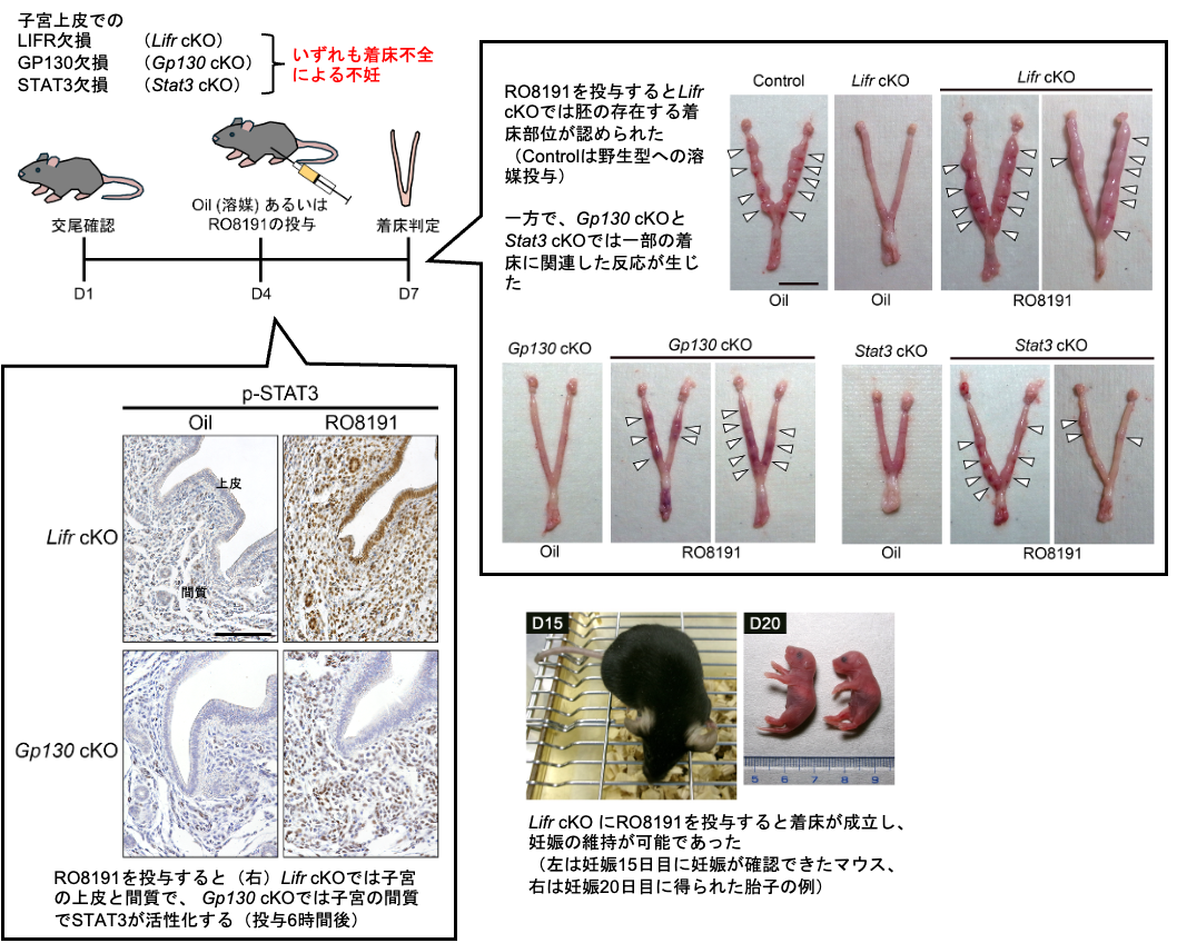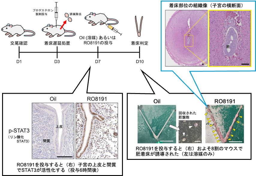しかし、これまでLIFに代わって胚着床を誘導できる化合物(薬剤)は知られていませんでした。また、STAT3のリン酸化を人工的に引き起こした場合に、着床から妊娠維持まで可能となるかどうかも不明でした。