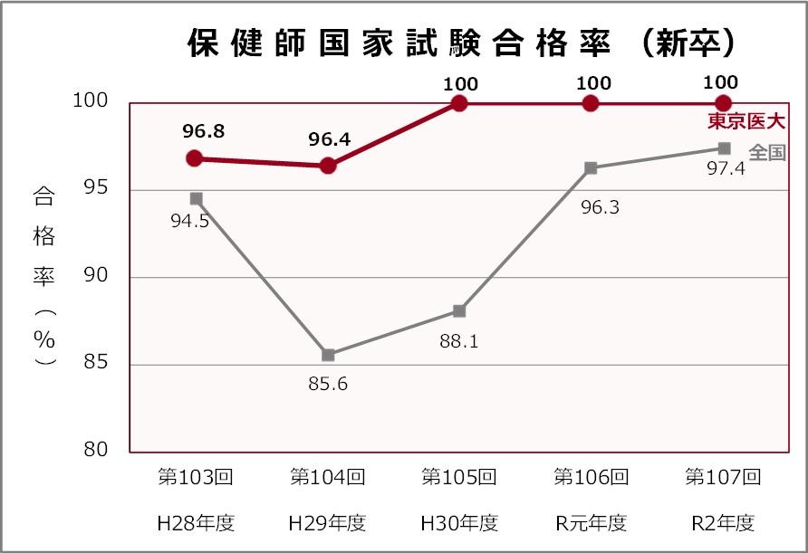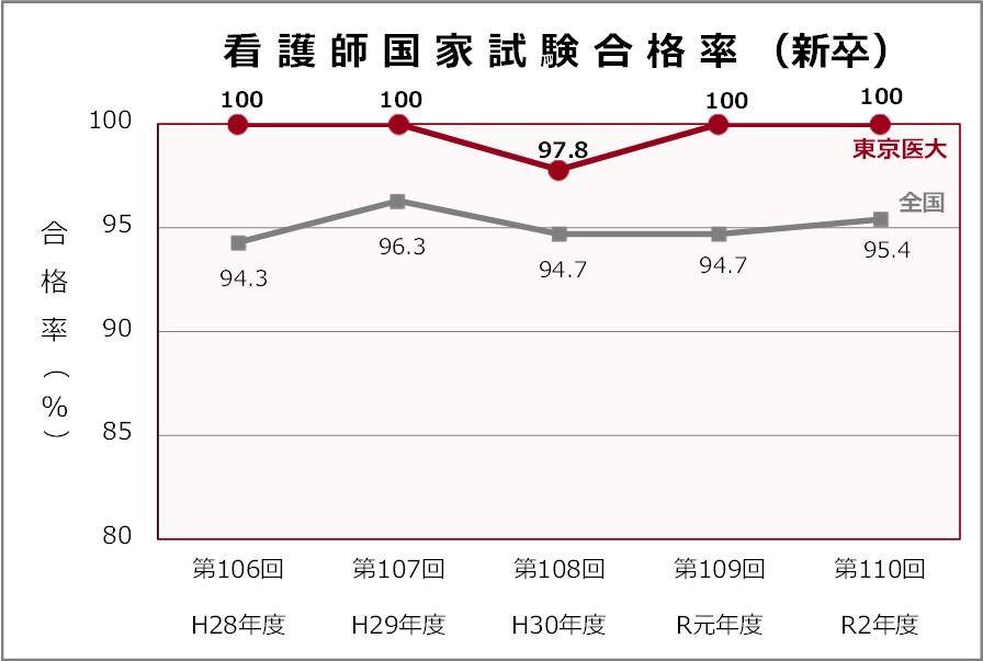 今回評価された同大の「教育力」は、令和2年度の国家試験の結果にも現れており、医学科では、医師国家試験 新卒合格率 98.3 %(全国平均 94.4 %)、過去12年間においても、新卒合格率平均 96.5%(全国平均 93.5 %)と継続的に高い水準で医師を輩出しており、看護学科でも、2年連続で看護師・保健師国家試験ともに新卒合格率100%という結果が出ています。