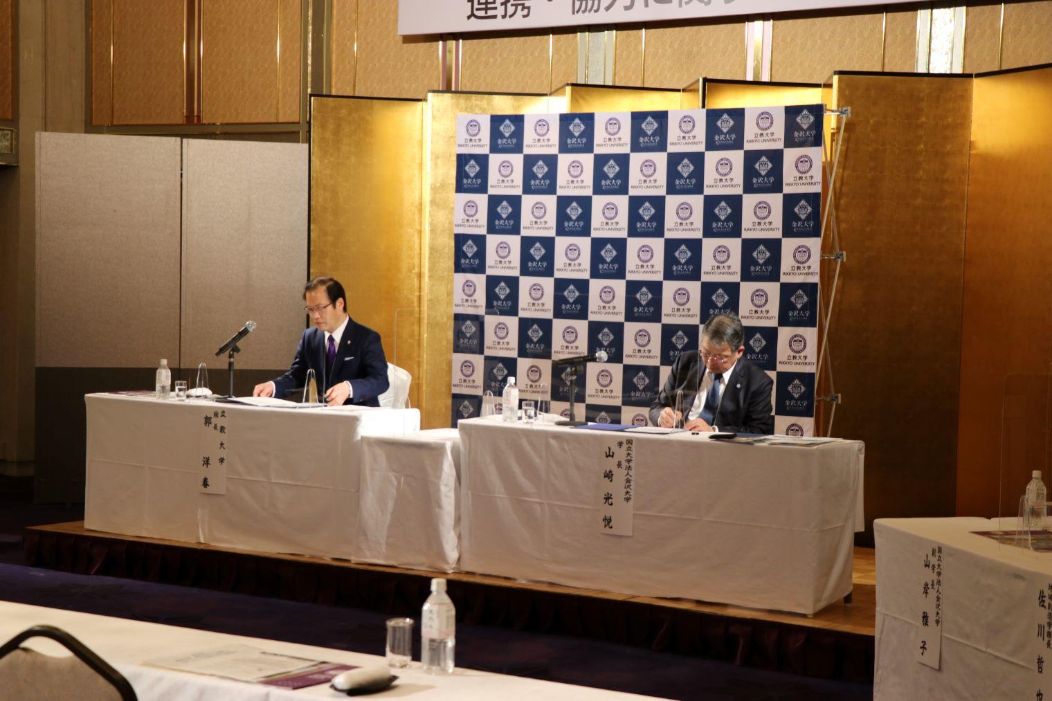 締結式は3月29日に、石川県七尾市の和倉温泉加賀屋で実施。金沢大学の山崎光悦学長ならびに立教大学の郭洋春総長のほか、協定締結への支援が大きかった株式会社加賀屋相談役の小田禎彦氏も列席し、調印を行った。なお、日本を代表する旅館である加賀屋は同地に本社を置いており、小田氏は立教大学のOBでもある。