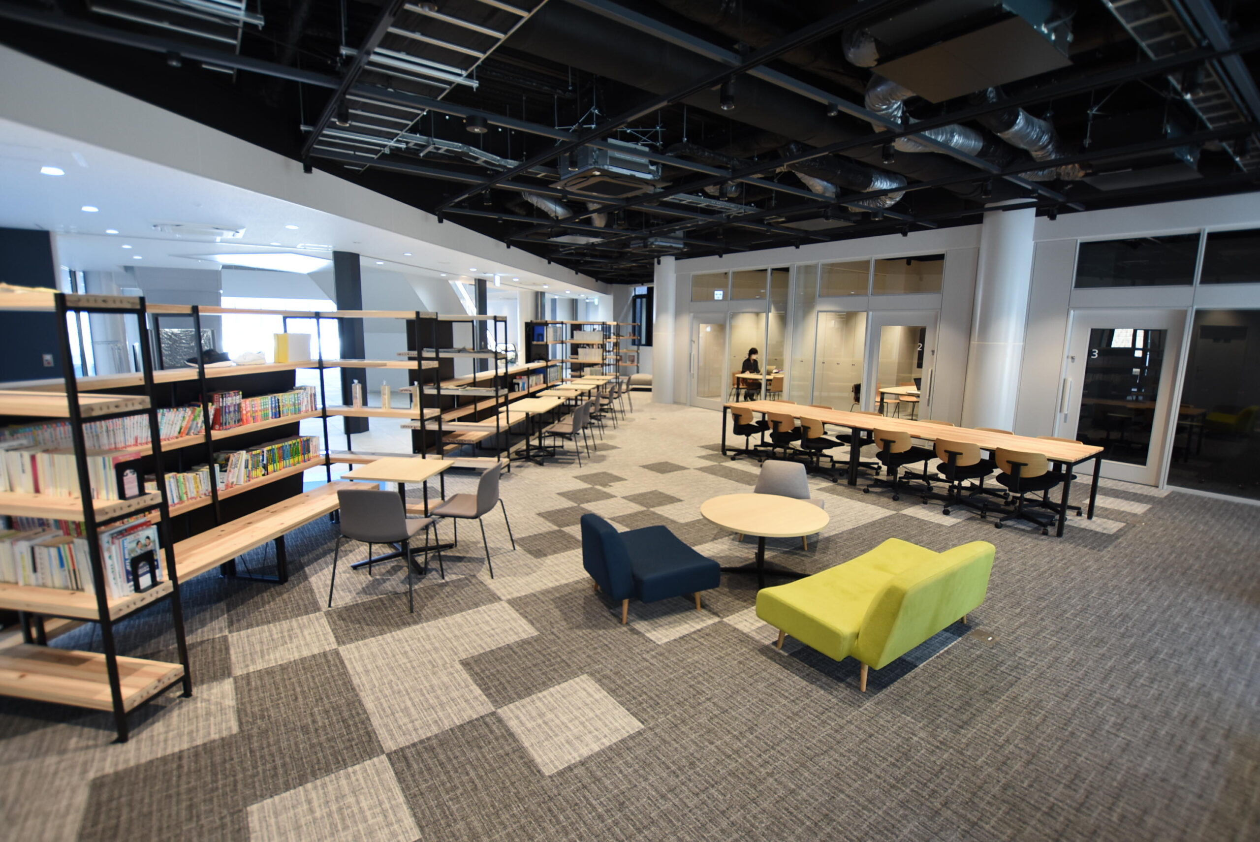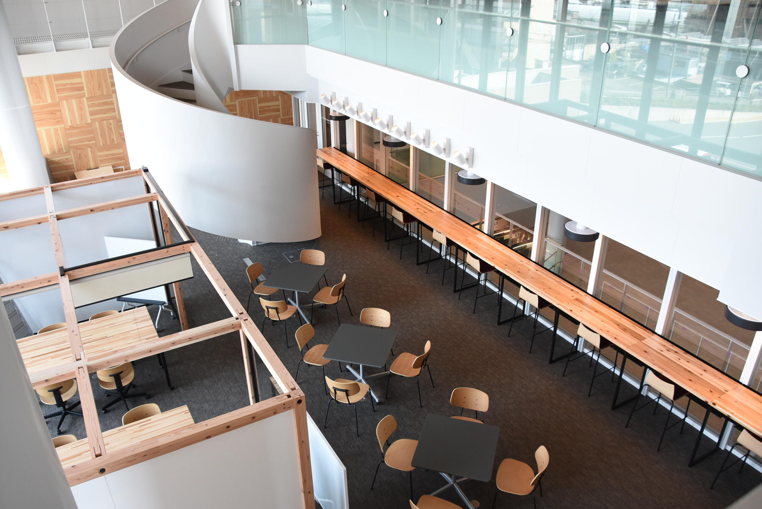 教員やLA(ラーニングアシスタント)が学習面をサポートする学習支援エリアを新たに設置します。基礎学力(数学)、ライティング(レポート・論文)などの学習支援や、授業や勉強方法に関する質問・悩みを気軽に相談できるスペースとなります。学生が集いやすいよう、明るく開放感のある吹抜け空間となっています。
