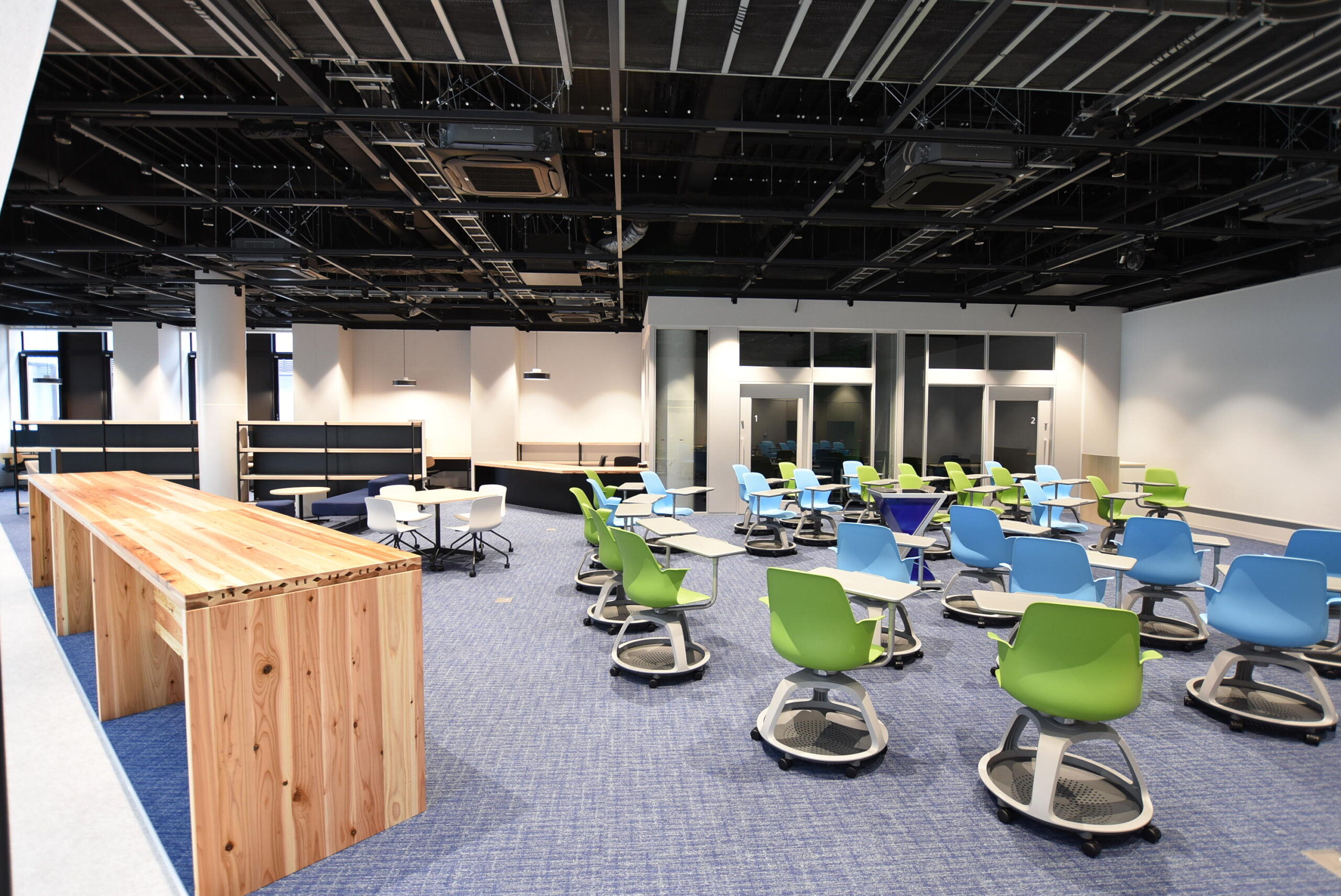 アカデミックリンクス内には、個人から少人数・大人数のグループまでさまざまな学習スタイルに対応できるコモンズや学習スタジオが多く配置されています。学習スペースには相互につなげられる可動式の個人デスクや、プレゼンテーション練習用のディスプレイやスクリーン、可動式ホワイトボードなどを数多く配置し、グループワークやプレゼンテーションに最適な空間です。