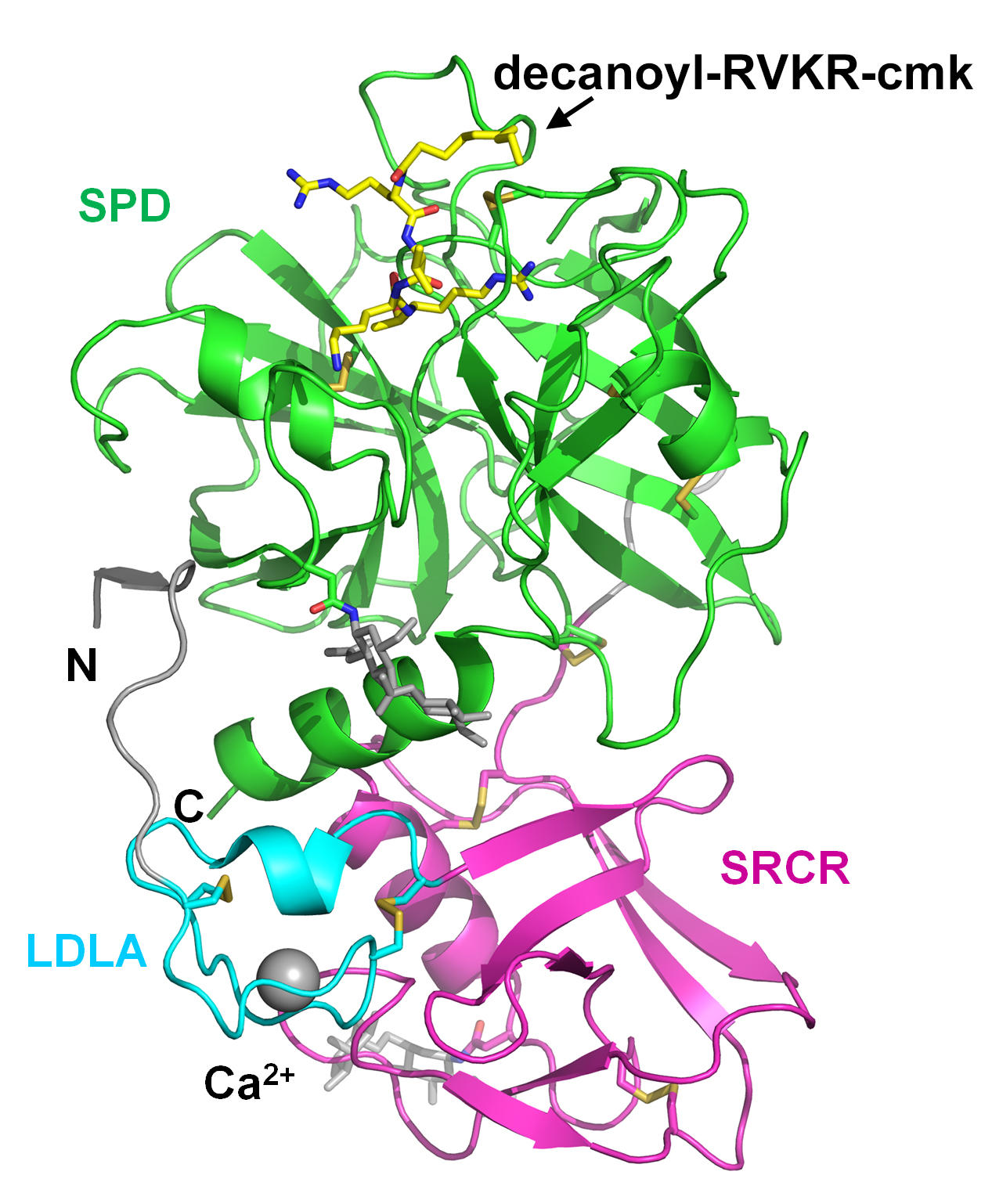多くのセリンプロテアーゼはアルギニン残基の直後を切断しますが、アルギニン残基の上流の3残基がリジン/アルギニンに富む配列(マルチベーシック)の場合、フーリン、PC5/6及びTTSPファミリーであるMSPLのみがこれを切断することが出来ます。マルチベーシック配列は主に高病原性鳥インフルエンザのHAで見られ、もし高病原性鳥インフルエンザが人で流行した場合、フーリンやMSPLによるHAの切断を抑えることが感染防止に重要です。マルチベーシック配列の認識機構の解明及び特異的な阻害剤の設計には詳細な立体構造解析が欠かせません。しかし、MSPLや類似タンパク質はこれまで構造が不明でした。