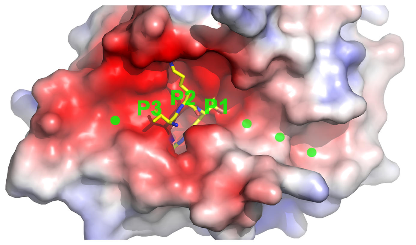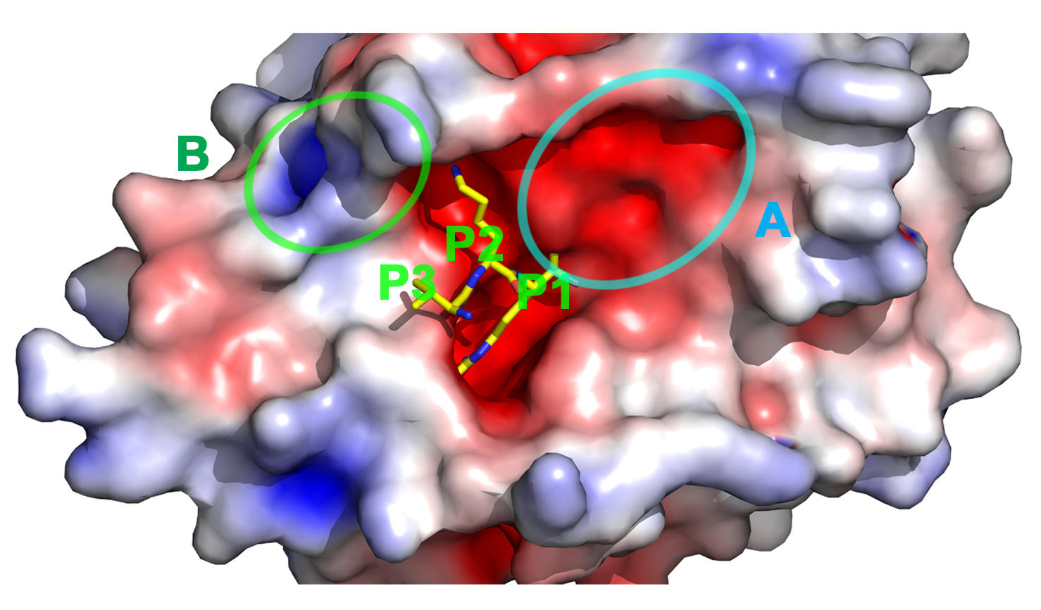 MSPLの細胞外領域はLDLA、SRCR、SPD3つのドメインから構成され、それぞれがお互いに接してコンパクトな構造をしていました。MSPLの活性部位表面はマイナスの電荷が多く広がっており、リジン/アルギニンは正電荷を持っているため、マルチベーシックに親和性を持つことが確かめられました(図2)。また、MSPLに非常に構造が似ているものの中に新型コロナのスパイクタンパク質を特異的に切断するTMPRSS2があります(図2)。TTSPファミリーの構造はこのMSPLが初めての例で、TMPRSS2の構造はまだ明らかになっていません。そこで我々はMSPLを鋳型にしてTMPRSS2のホモロジーモデルを作り、新型コロナスパイクタンパク質への認識機構を調べました。TMPRSS2では切断されるペプチドのアルギニン残基の下流が結合する領域の溝が通常より広くなっており(図3)、ペプチドがほどけた状態でなくても結合することが出来ることが判りました。新型コロナのスパイクタンパク質の切断部位の構造を見ると、アルギニン残基から下流はαヘリックス構造を取っているため、この切断部位はほどけにくく、TMPRSS2以外のプロテアーゼでは切断しにくいことが推察されました。