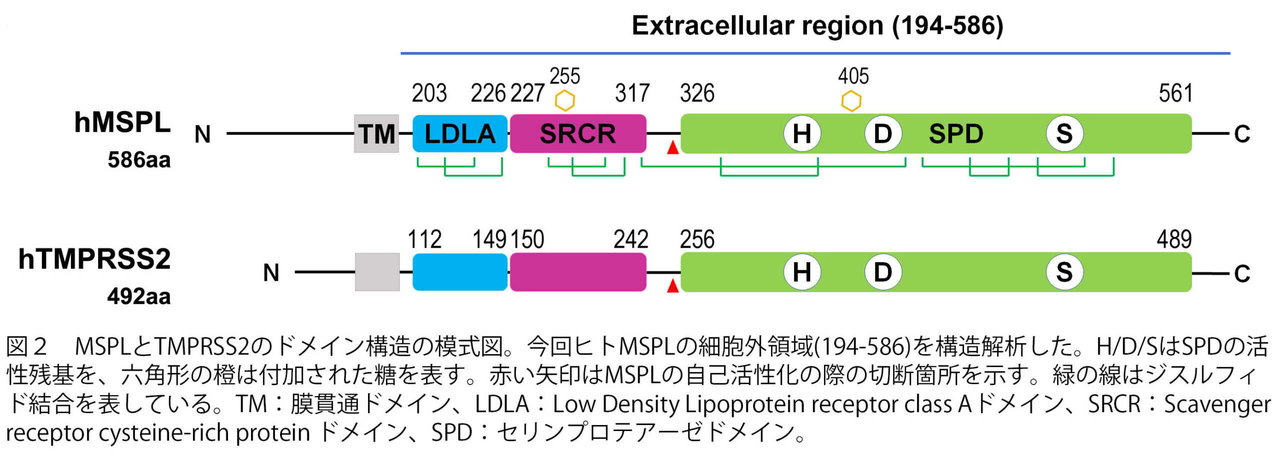 MSPLの詳細な結晶構造が明らかになったことで、MSPL特異的な阻害剤の開発が促進されます。さらに今年になってMSPLもTMPRSS2と同程度新型コロナを活性化させるという論文が複数報告されており(1,2)、MSPL阻害剤は新型コロナの有効な薬剤候補となります。また、信頼度の高いTMPRSS2のモデルを利用して、新たな阻害剤の開発やTMPRSS2のスパイクタンパク質との結合予測、さらにACE2との複合体モデルの構築など、新型コロナに対する有効な治療薬・感染予防薬の開発が進むと期待されます。