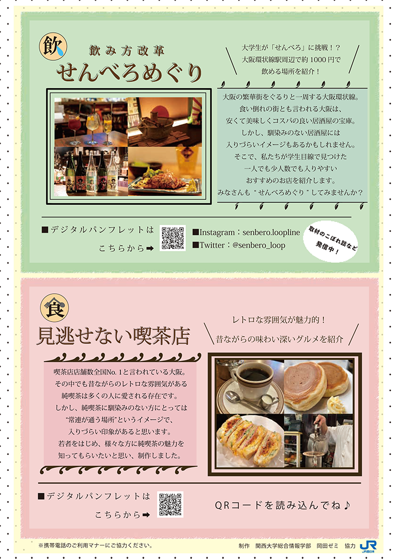 ◆関西大学総合情報学部・岡田朋之ゼミ「JR西日本沿線の魅力発見パンフレット」を制作◆穴場スポットぶらり旅 ~幸せ土産、せんべろ巡り、見逃せない喫茶店~