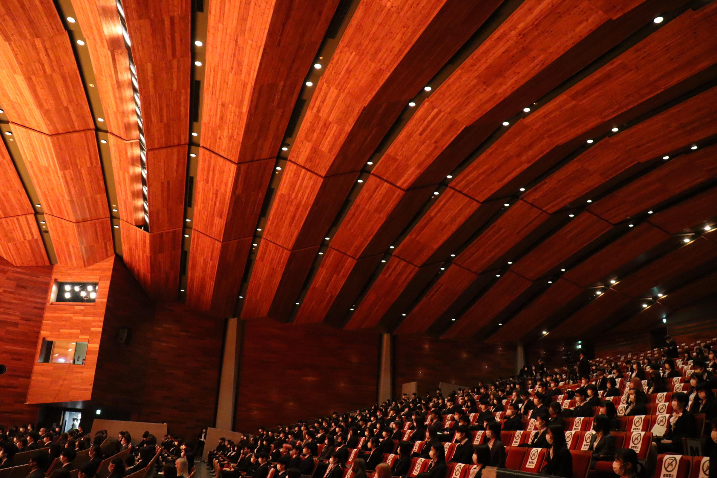新型コロナウイルス感染症予防の観点から、式典は新入生のみの参加で学部別に四回開催し、ご家族の皆様には、ご自宅等でライブ配信をご覧頂きました。