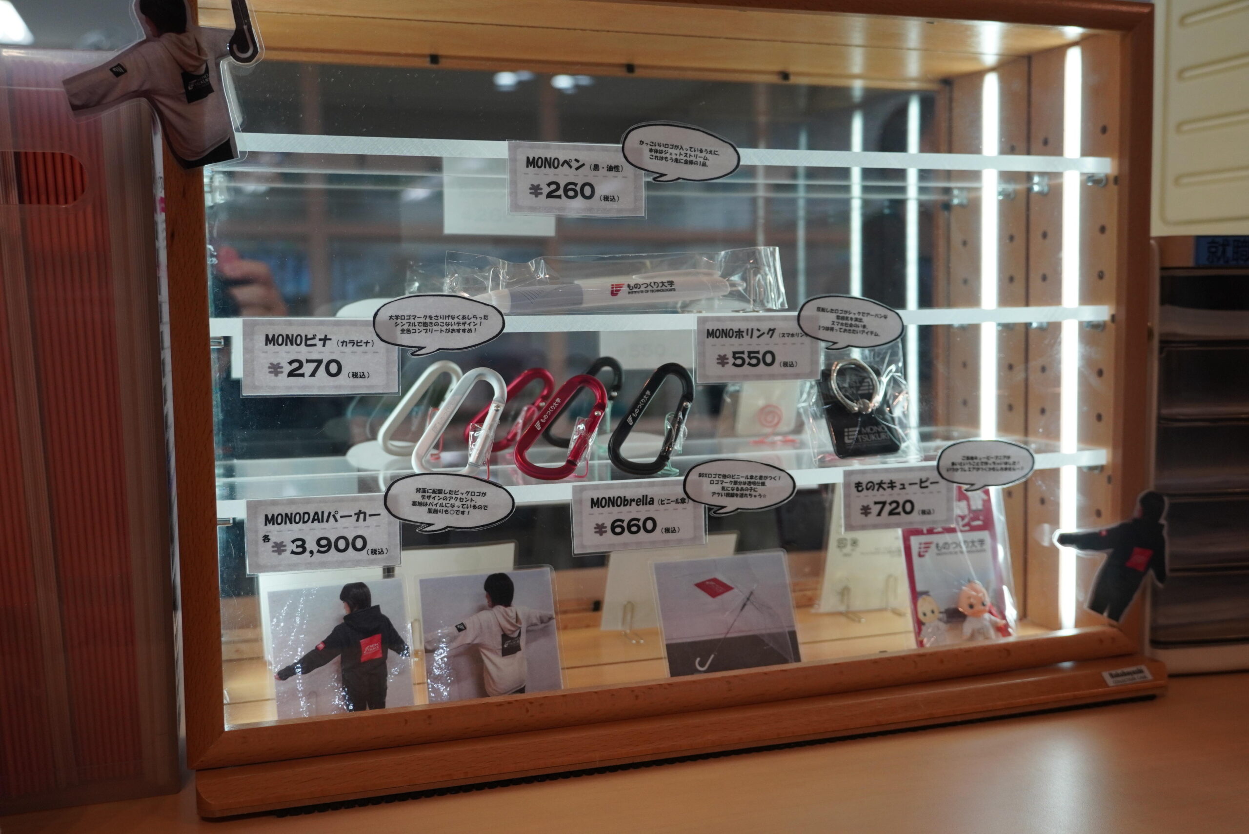 愛されるものつくり大学を目指して、グッズにはユニークなネーミングをつけています。作業着姿の「もの大キューピー」は大学グッズ・コレクターには垂涎のグッズ。そのキュートさが好評です。学内では、本部棟1階学務部窓口で販売中です。ホームページにアクセスし、申込フォームに入力していただければ、学外の方も購入、郵送可能です(郵送料別途。傘は大学窓口のみの販売となります)。