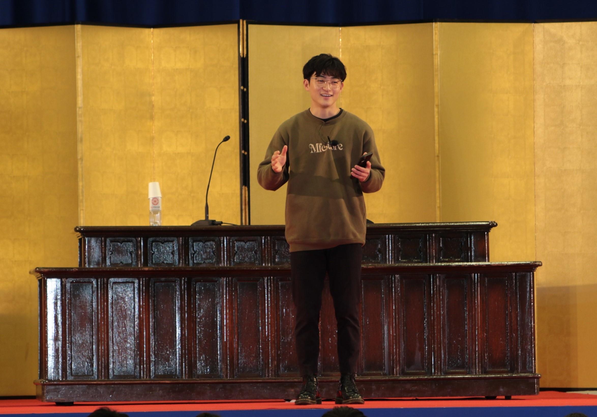 なかでも、在学生代表による歓迎・激励のメッセージと歓迎企画は、サプライズ企画として実施。在学生代表としてTikTokクリエイターの修一朗さんが登壇し、歓迎企画では、実業界、法曹、マスコミ、スポーツ、タレント、音楽など、各分野で活躍しているOB・OG約30名による激励・応援メッセージ動画の一部を上映した。さらに、サプライズゲストとして漫才コンビの東京ホテイソン(たける氏が商学部卒業)が登壇した。