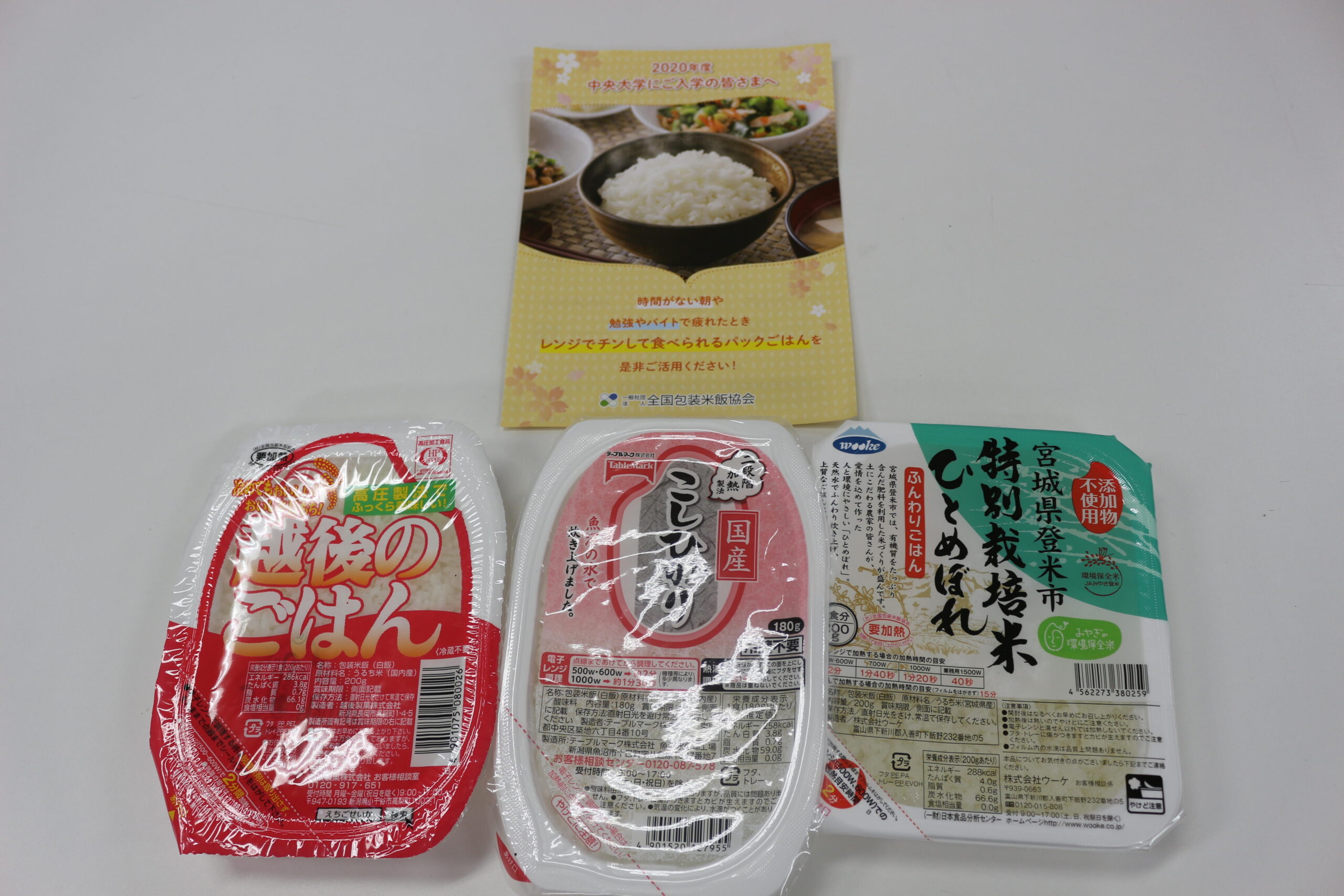 なお、セレモニー当日には、一般社団法人全国包装米飯協会より、地方出身の学生が多い同大に対する厚意として計9,000個のパックご飯の無償提供があり、新2年生に配布した。