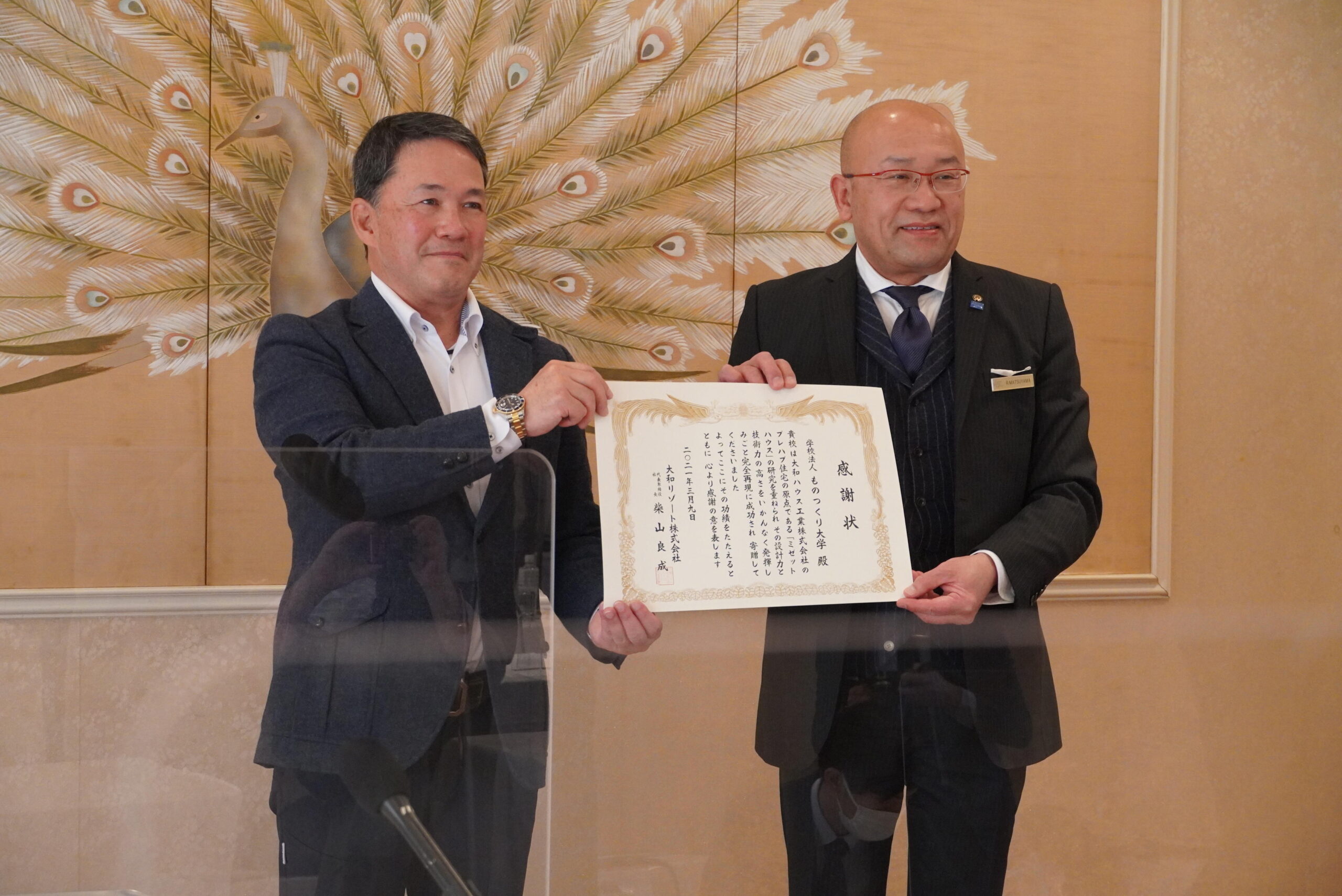 開学20周年を迎えたものつくり大学(埼玉県行田市)の三原斉(みはら ひとし)建設学科教授の研究室では、工業化工法序開の建築構工法を知るにあたって、住宅の工業化を加速させ、その後住宅革命と呼ばれるイノベーションを起こした「ミゼットハウス」(大和ハウス工業株式会社が開発)を最も適切な実習教材として、2015年4月から2020年3月までの5年間学んできました。この度、復元に成功した「ミゼットハウス」を大和ハウスグループの大和リゾート株式会社が運営するロイヤルホテル能登(石川県羽咋郡志賀町矢蔵谷ラ-1)に寄贈いたしました。組立てには学生7人が関わり、当時と同じ3時間で完成させました。コロナウイルス感染拡大防止対策に十分配慮した会見も行われ、大和リゾート株式会社よりものつくり大学に感謝状が贈呈されました。今後、ミゼットハウスはホテル内に展示され、来館者に公開されます。