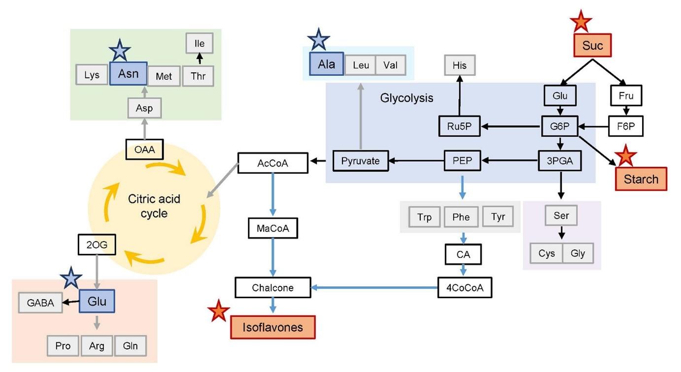 (A) 可溶性糖および澱粉含量。(B) 遊離アミノ酸含量。 (C) イソフラボン含量。