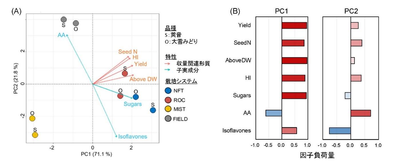・図5:収量関連形質および子実成分の主成分分析(PCA)