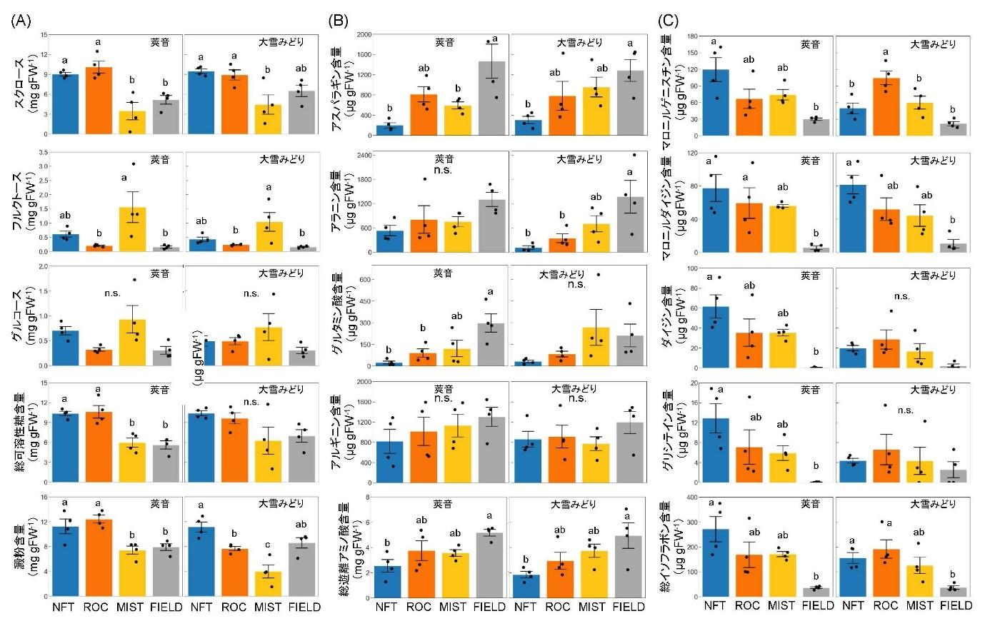 3種類の栽培システム(NFT=養液膜栽培、ROC=ロックウール栽培、MIST=噴霧栽培)を比較した結果、NFTで最も茎や葉の成長が旺盛でした。露地栽培(FIELD)よりも多くのバイオマスを生産し、植物工場でも力強く育つことが示されました(図3)。