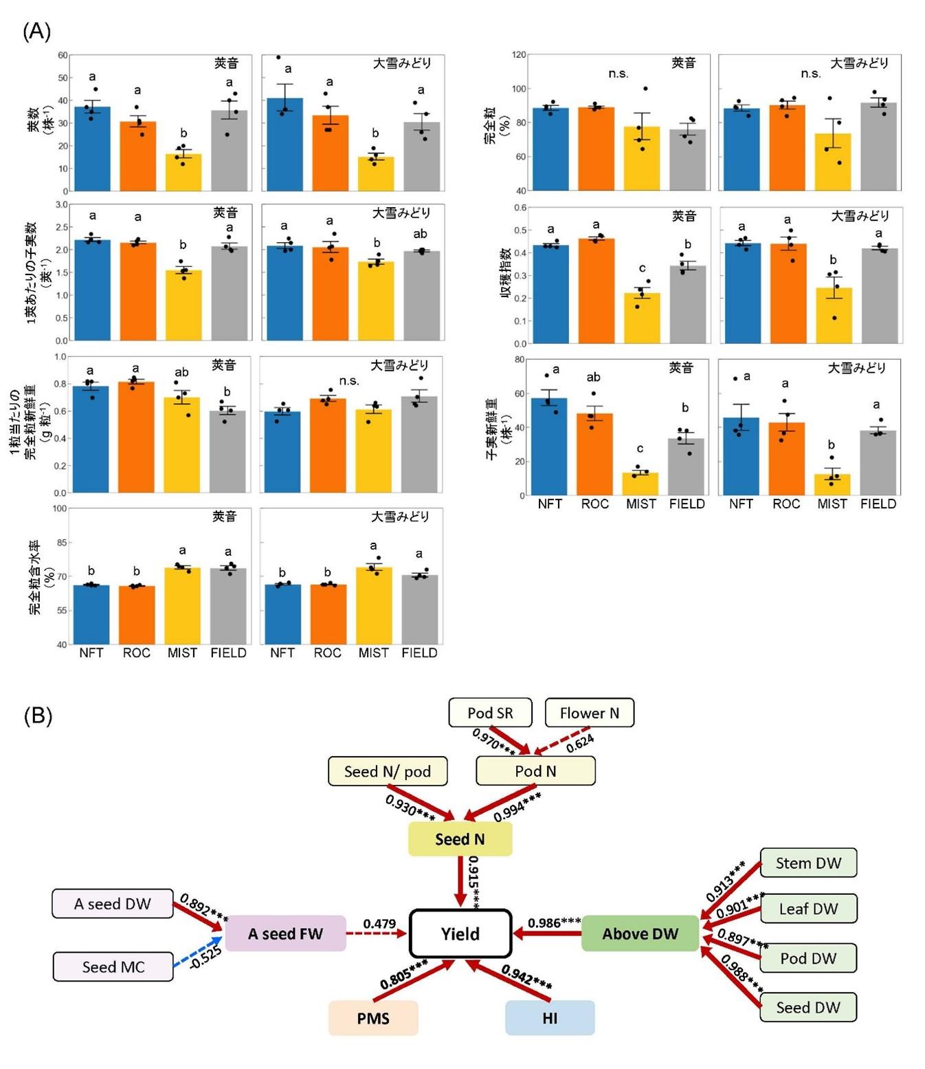 収量を左右するのは花の数よりも、どれだけ効率よく莢をつけられるかでした。NFTでは莢の数と種子数が多く、結果として収量は露地を上回る水準となりました。つまり「畑より多く収穫できるエダマメ」を工場で実現したのです(図3)。