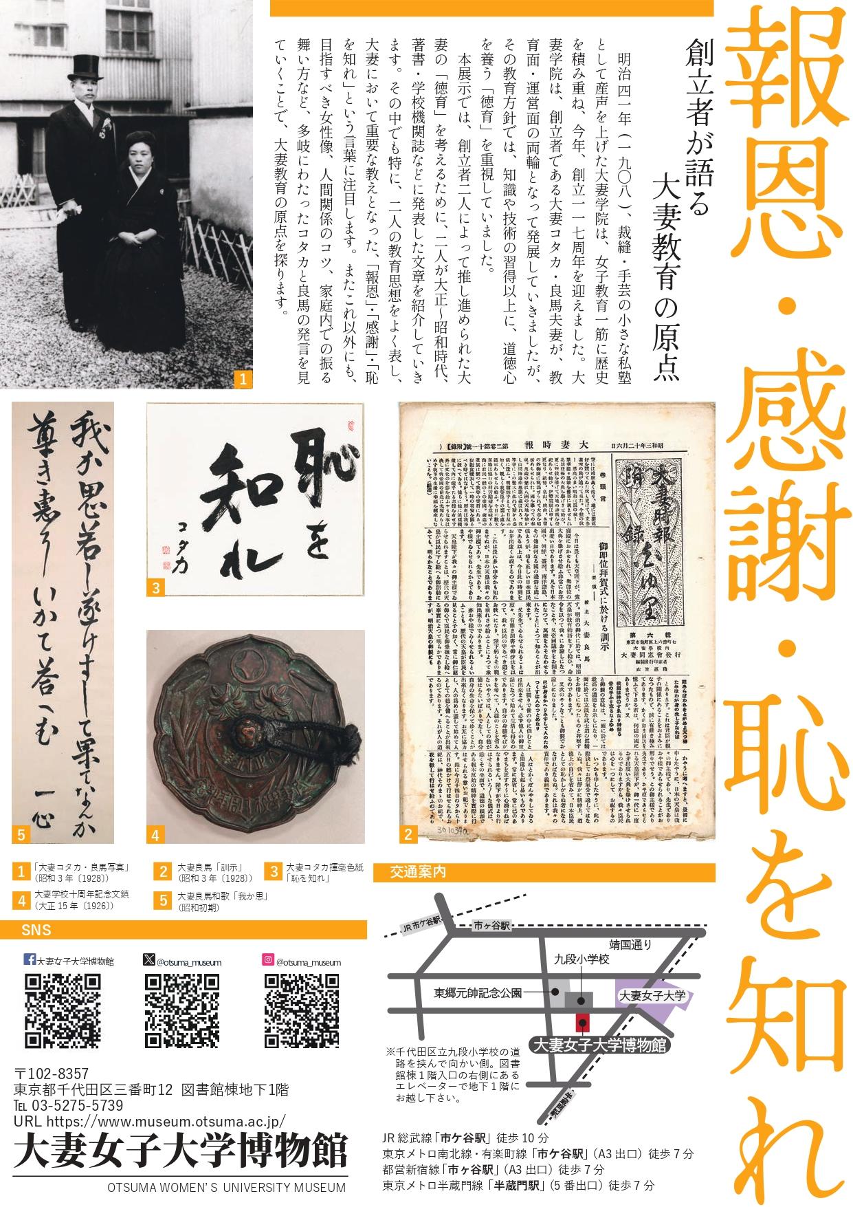 大妻女子大学博物館で9月29日~11月28日まで企画展「報恩・感謝・恥を知れ ― 創立者が語る大妻教育の原点 ―」を開催 ~ 大妻コタカ・良馬夫妻の言葉から大妻教育の原点を探る