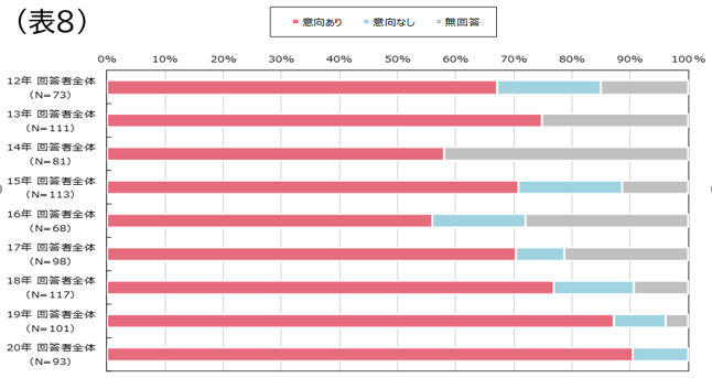 ◆2012年は海外留学に意向がある学生は約67%だったことに対し2020年まで90%まで伸びています。反対に海外留学の意向がない学生は2012年の17.8%に対し2020年は9.7%と下がっています。上記より、コロナ禍でも留学に前向きであることが分かります。