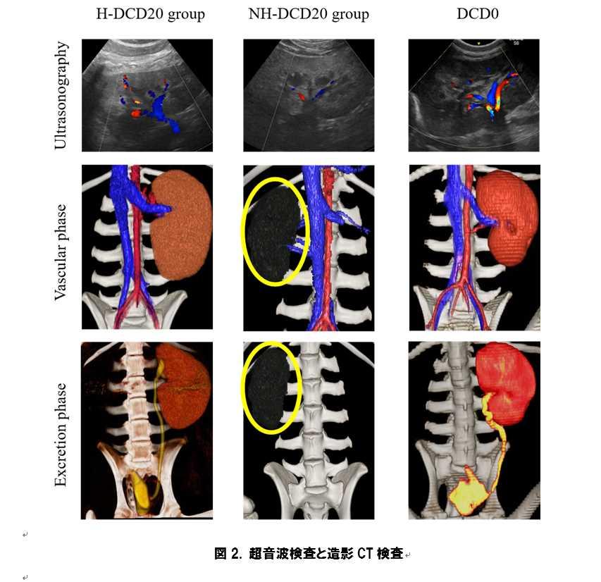 水素を充填した保存液を用いた腎臓を移植した腎臓は、術後経過における超音波検査や造影CT検査において、十分な血流が認められたのに対して(図2. H-DCD20 group, 左の列)、水素を充填していない保存液を用いた腎臓は全く血流がみとめられなかった(図2. NH-DCD20 group, 真ん中の列)。